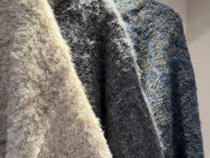 起毛素材のニットカーディガンとハイゲージのニットワンピースのセット。