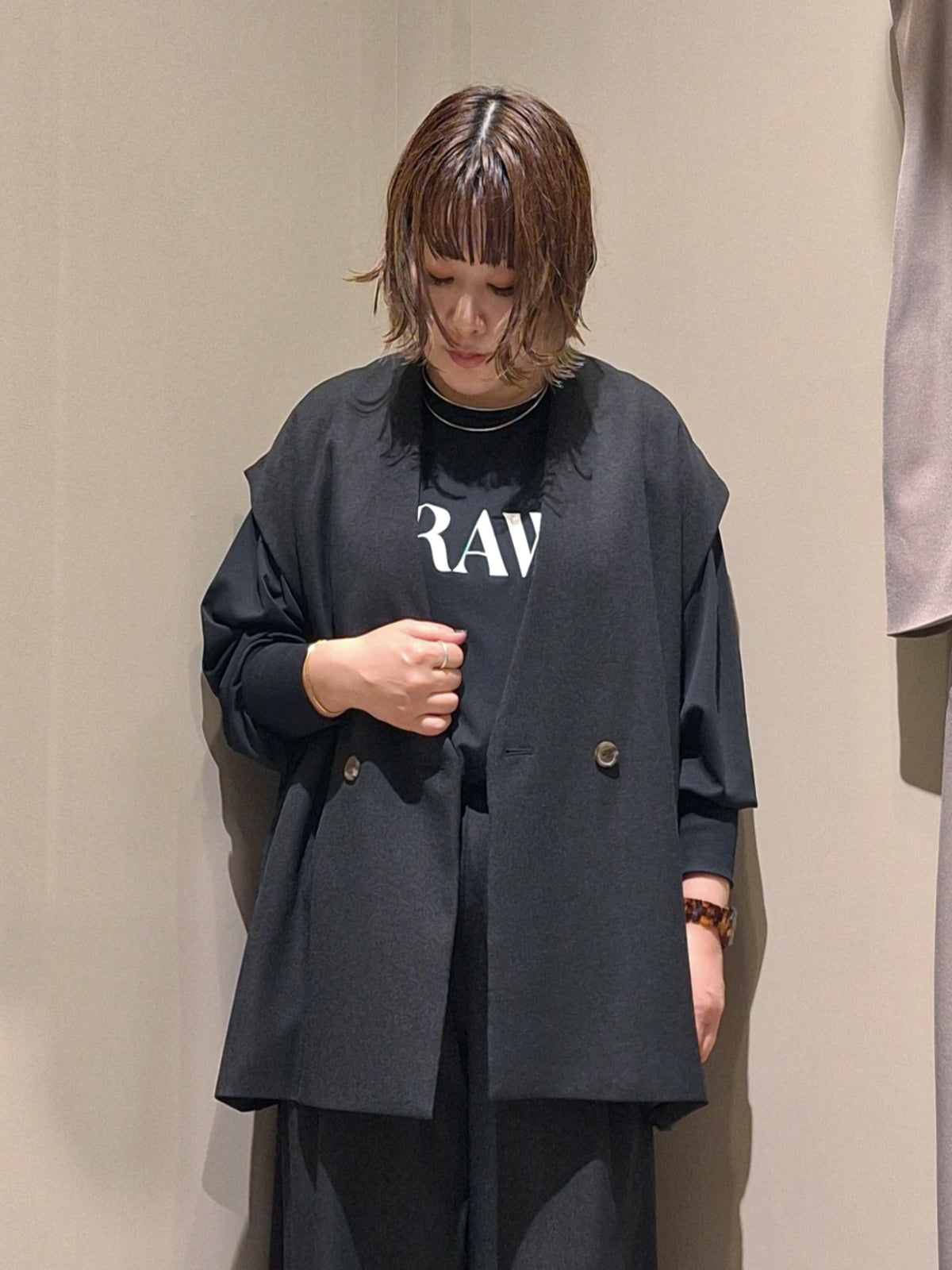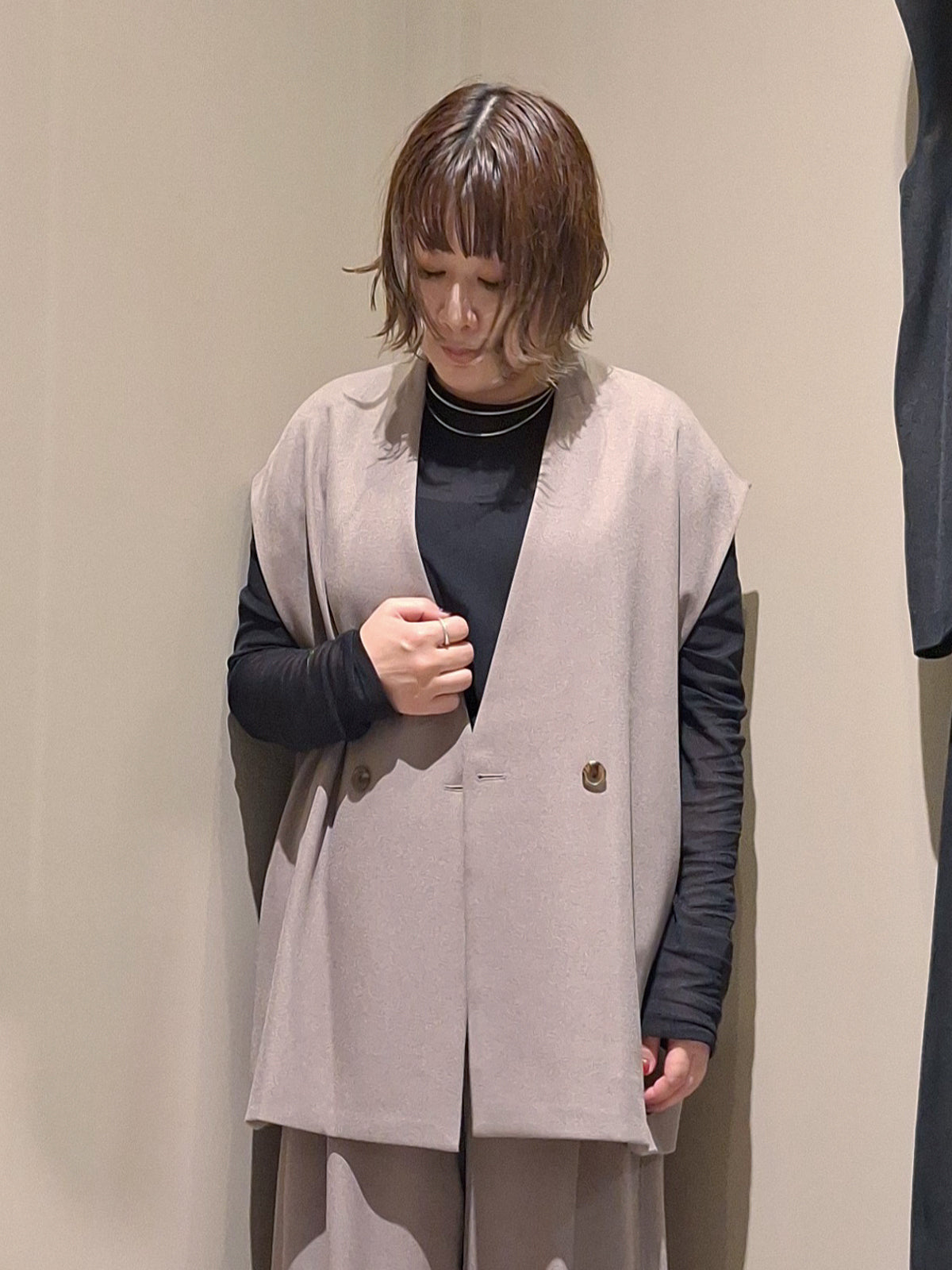 ダブルのノーカラーベストは襟元が首にかかるデザインでスッキリとした見え方にしました。