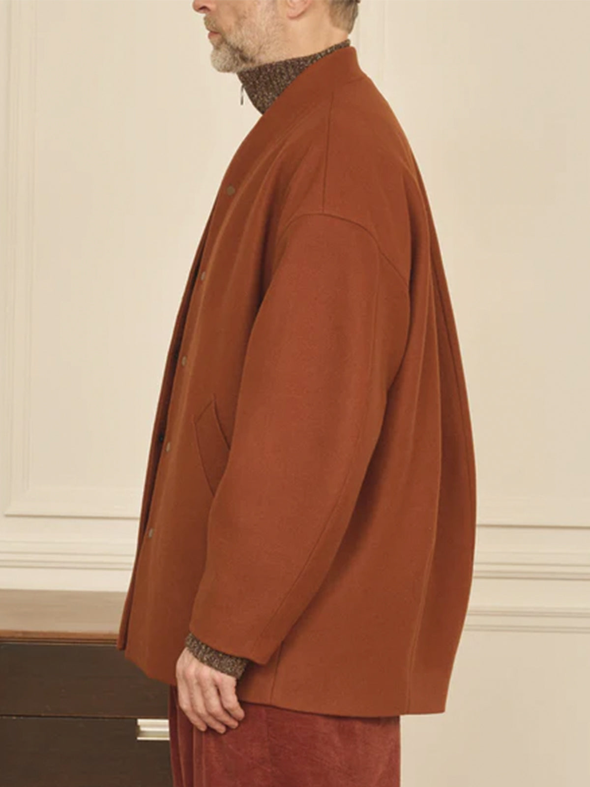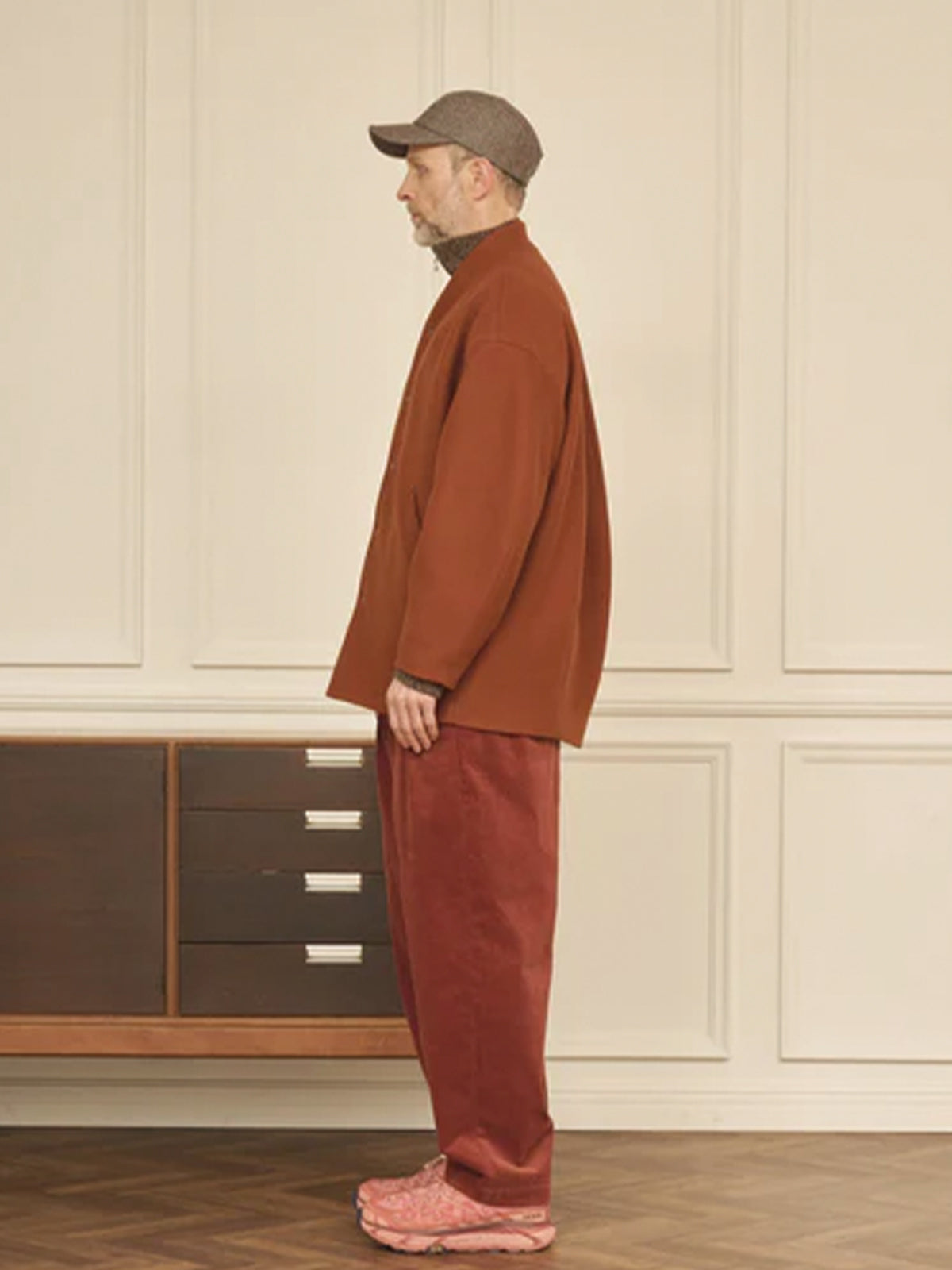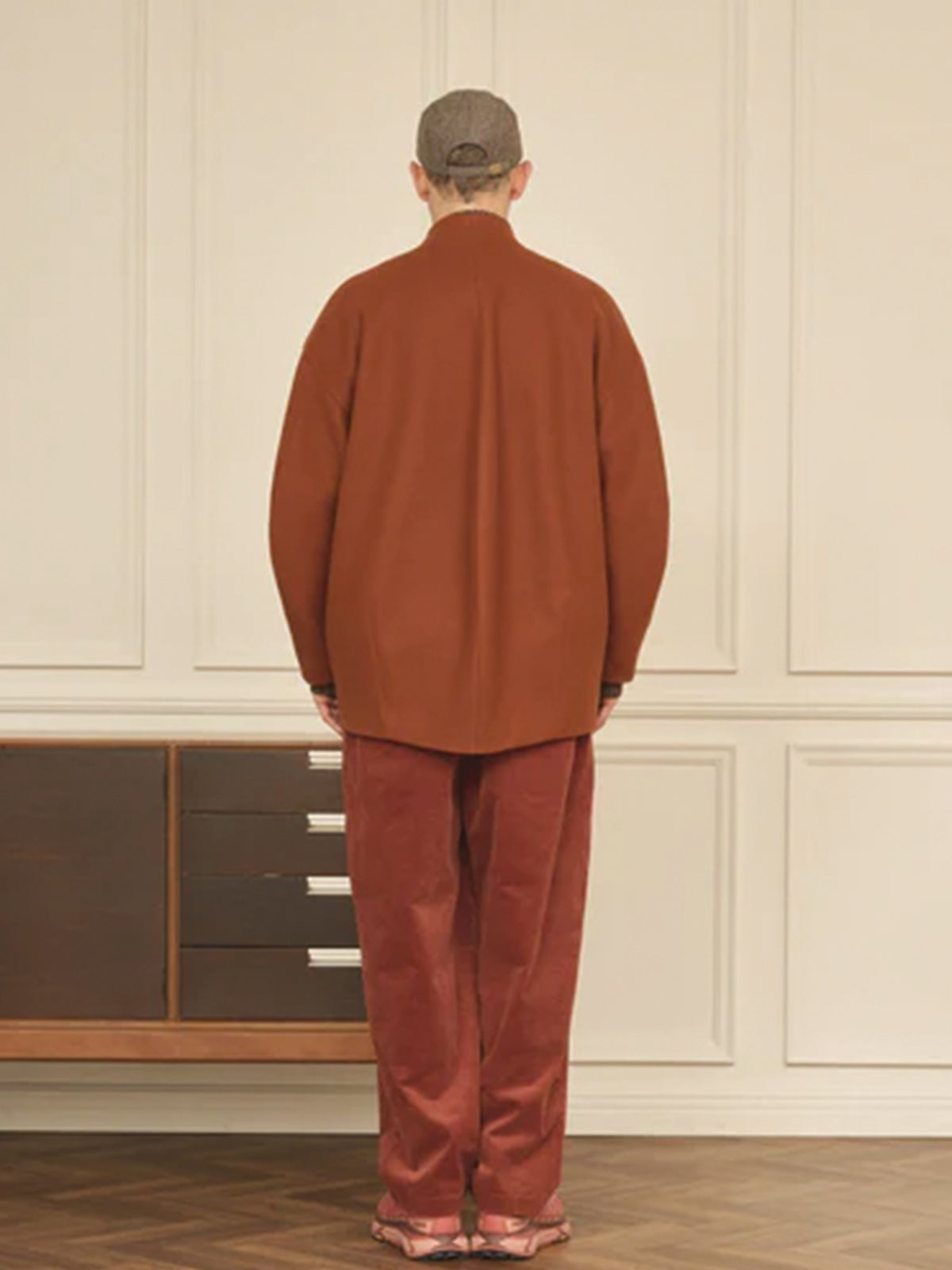 首元のダーツから立ち上がる変形のモックネックもデザインアクセント。