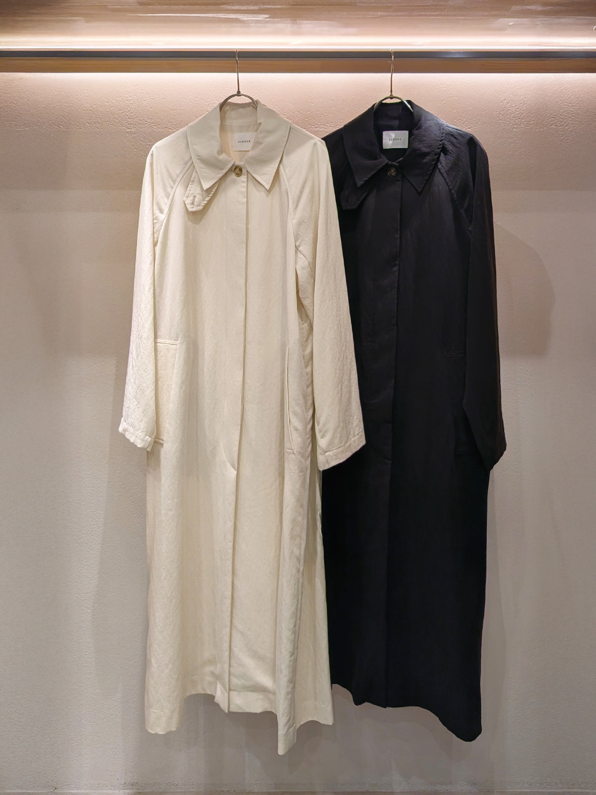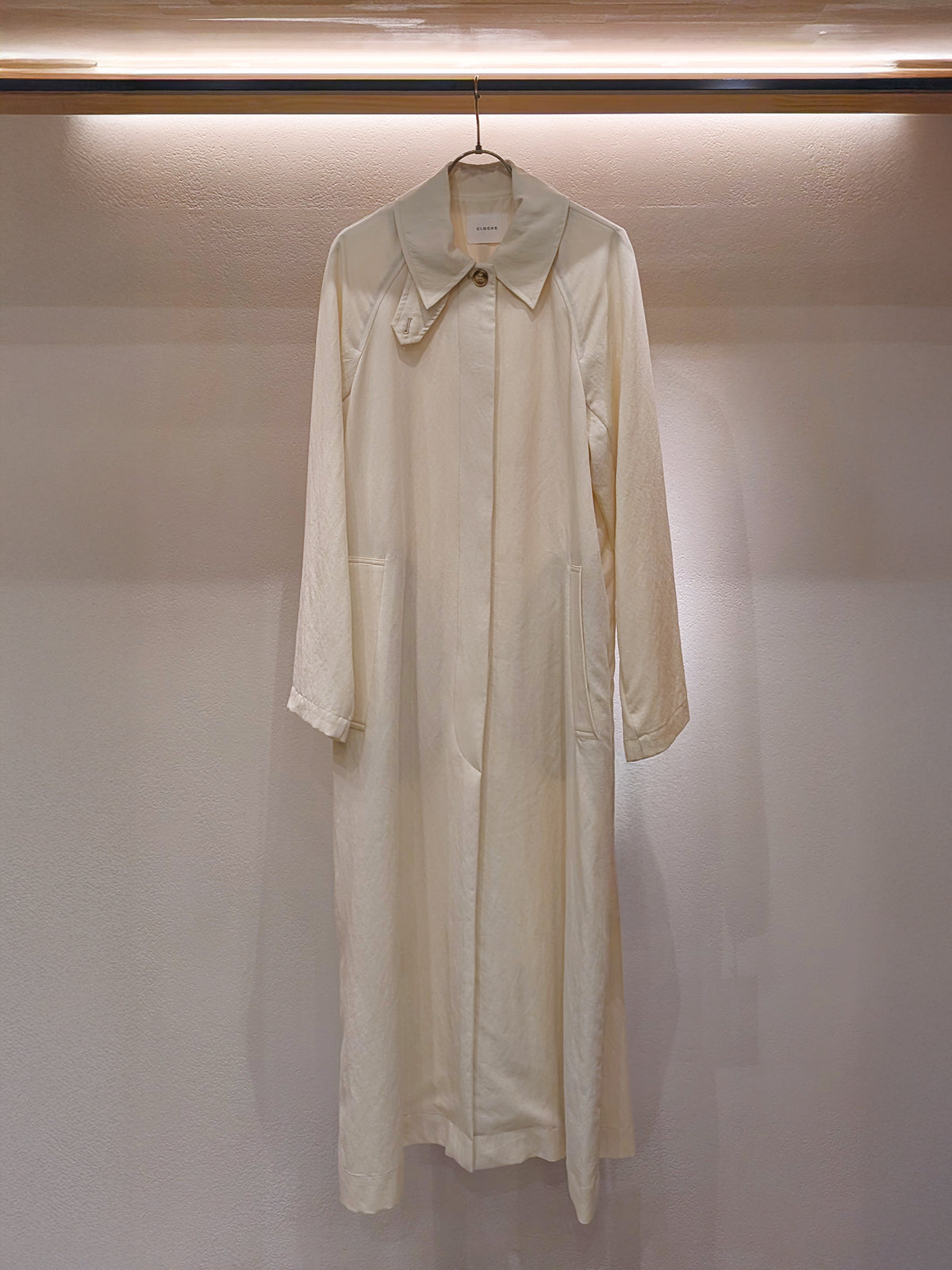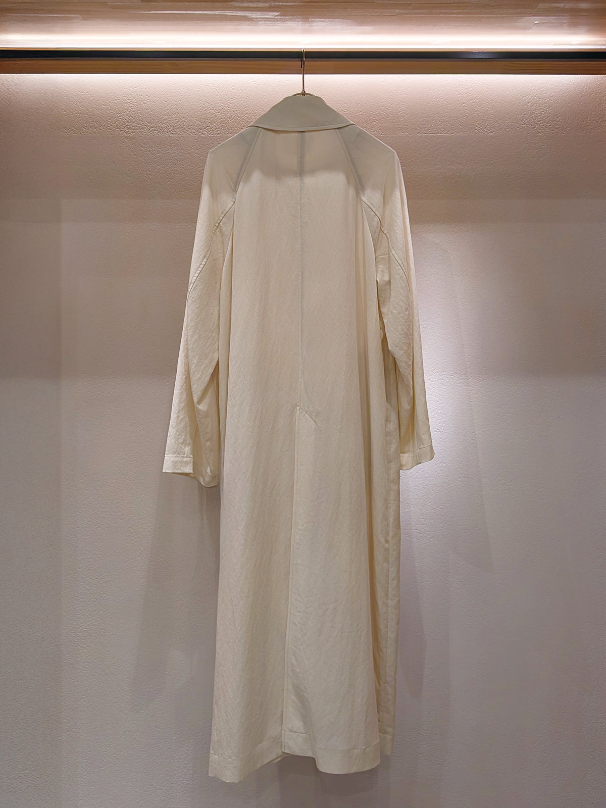 セルロースのロングコートは今年らしい雰囲気の生地感。襟元のタブでスタンドカラーとしても着用いただけます。