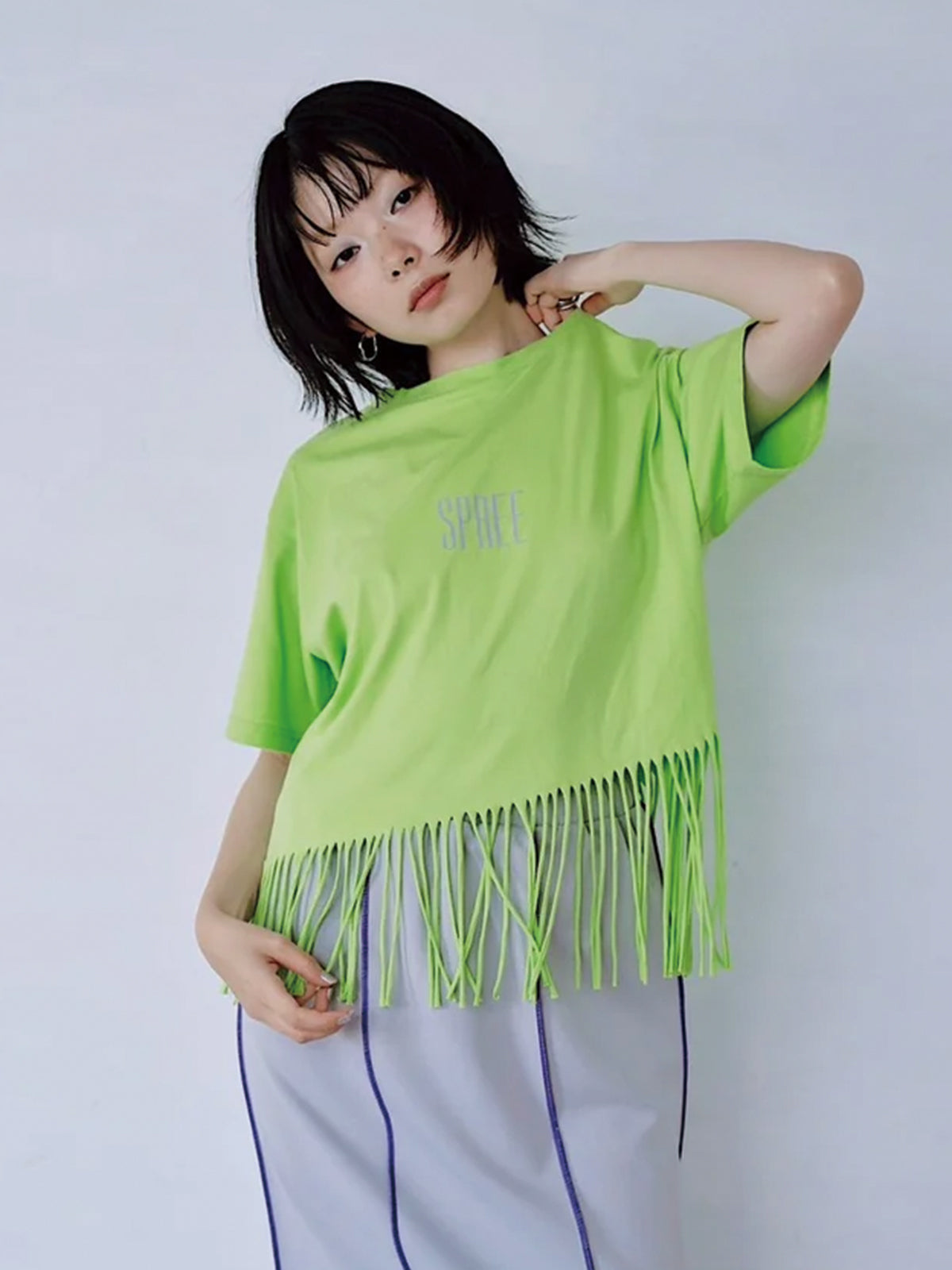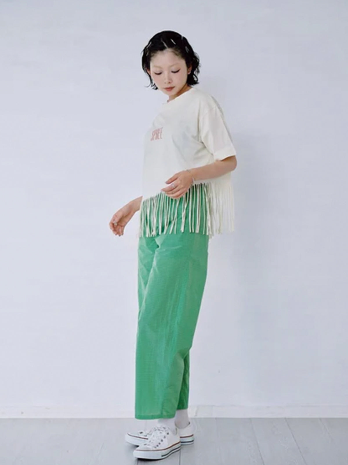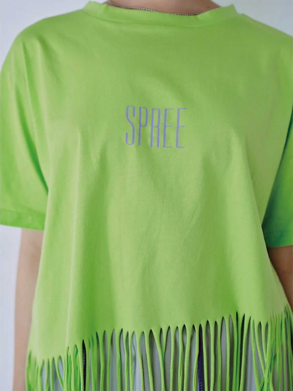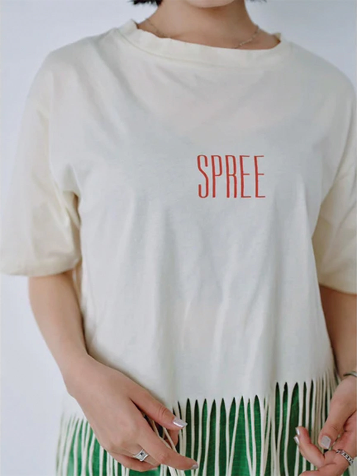 裾にフリンジを施したプリントTシャツ。