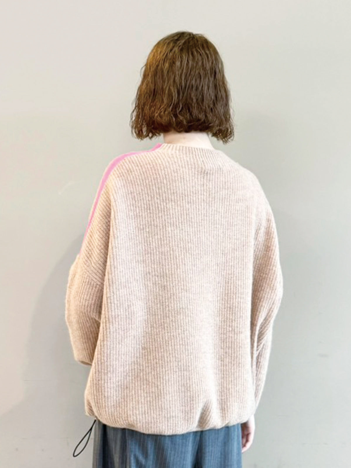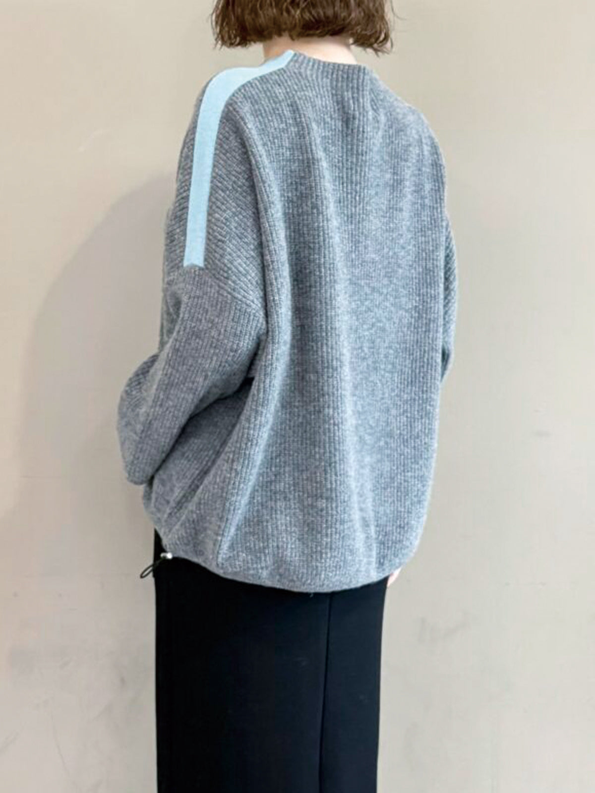 ドロップした肩幅や、用尺をたっぷりと使用したワイドなシルエットがこなれ感のあるリラックスした雰囲気の1着。首に沿うようにゆったりと立ち上がったネックに、肩からネックにかけて施したカラーラインがシャープな印象に。
