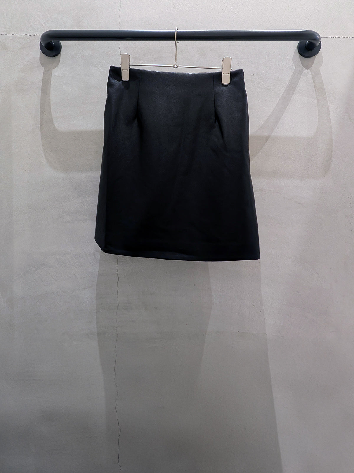 セミマットなフェイクレザーで仕上げた、女性らしさを引き出すミニスカート。