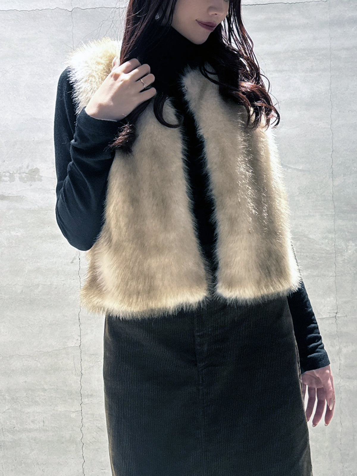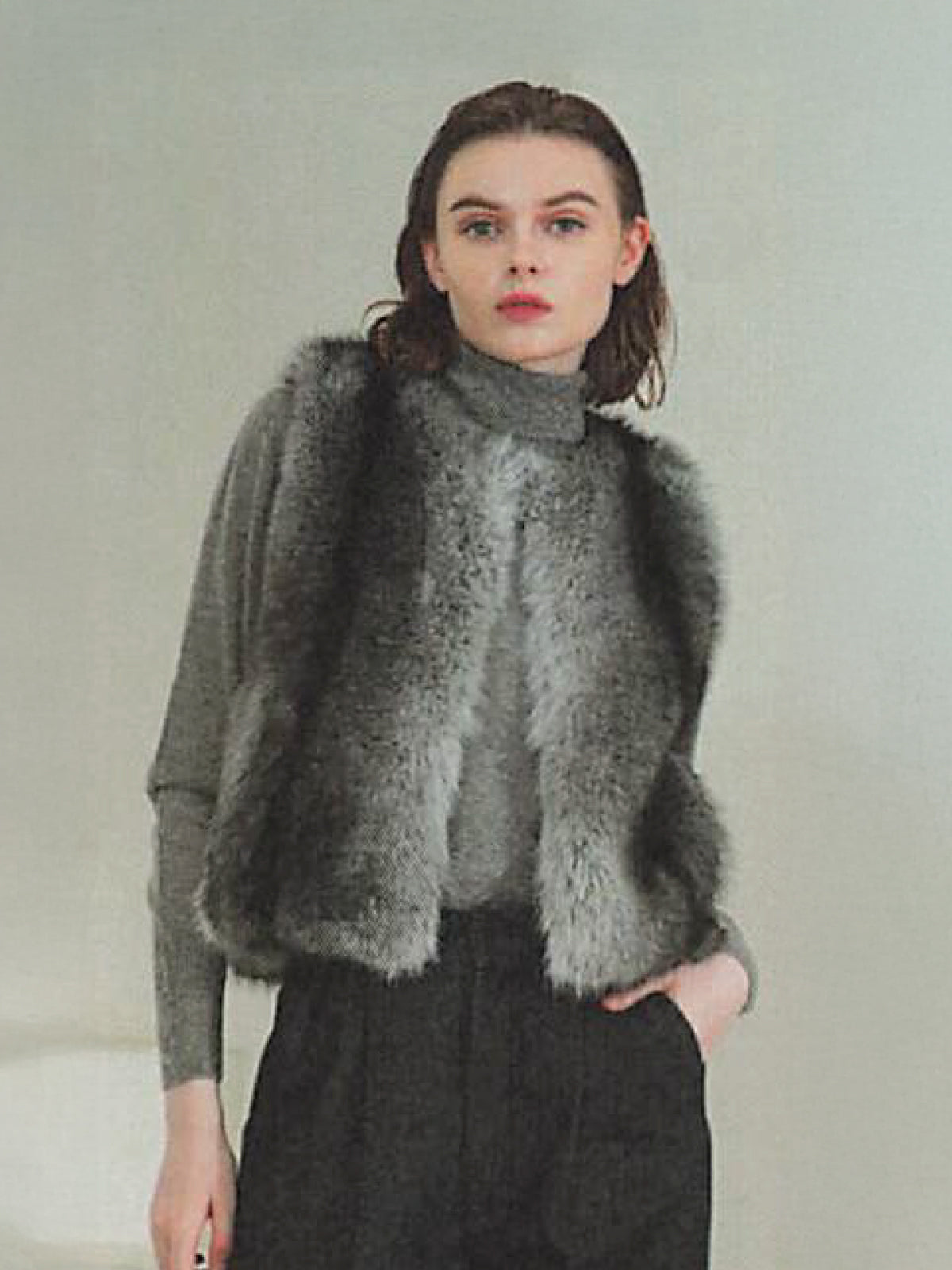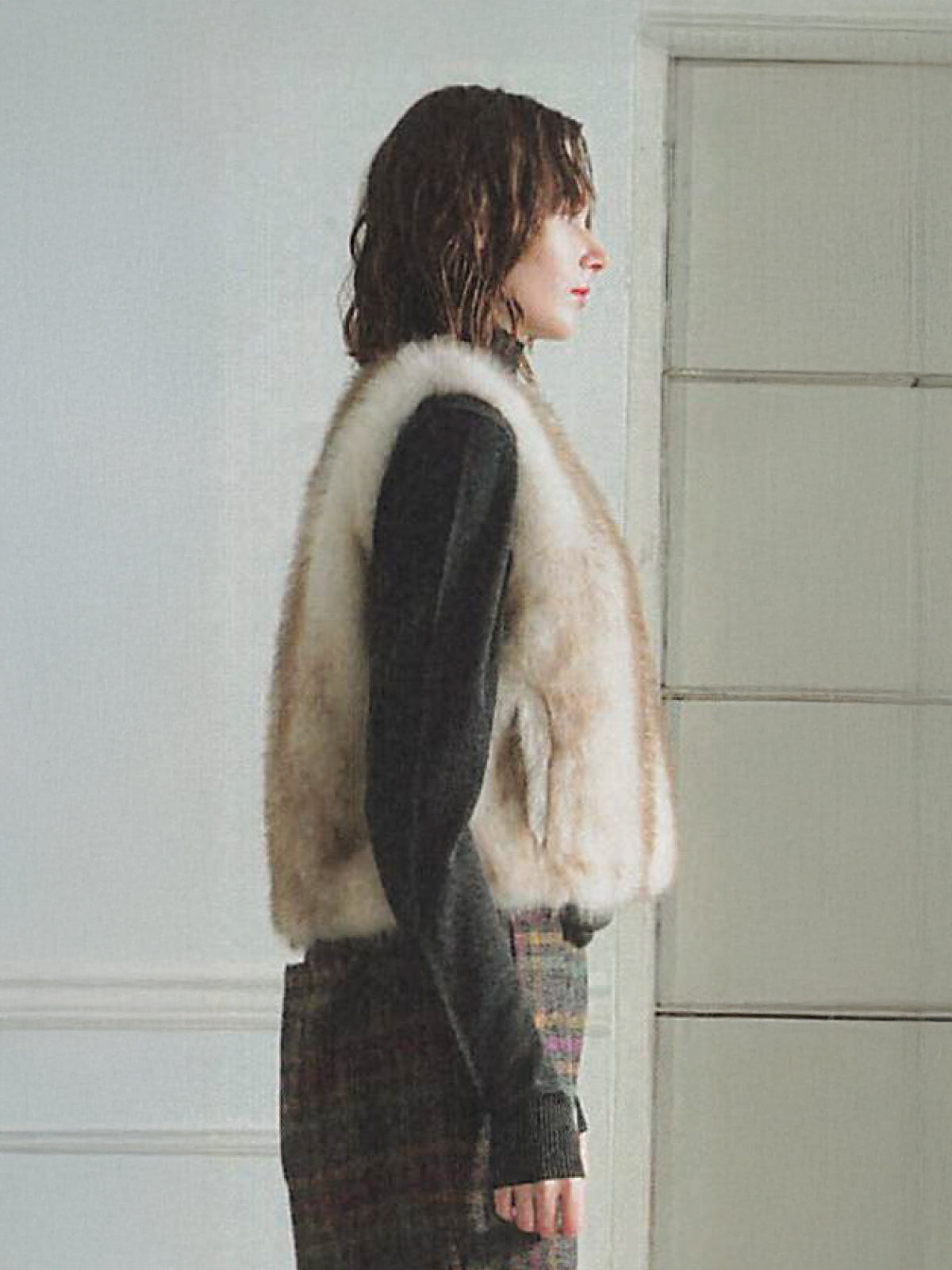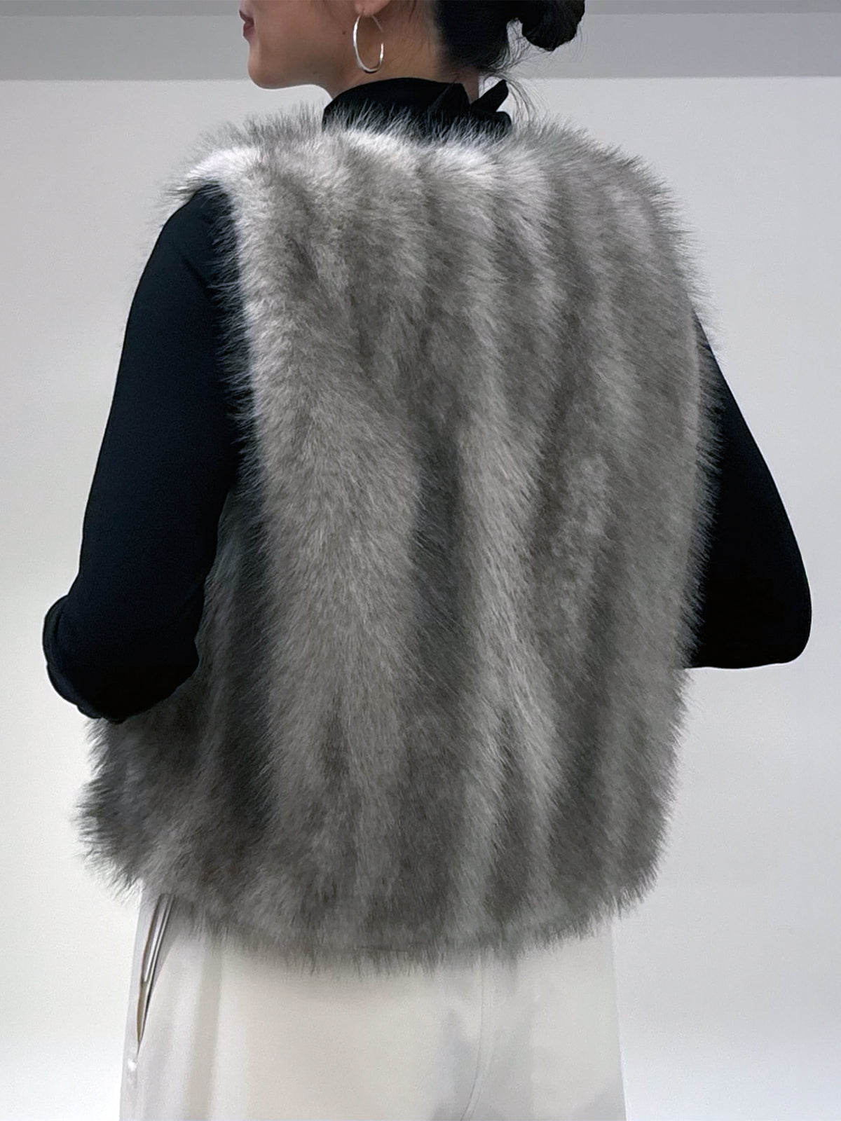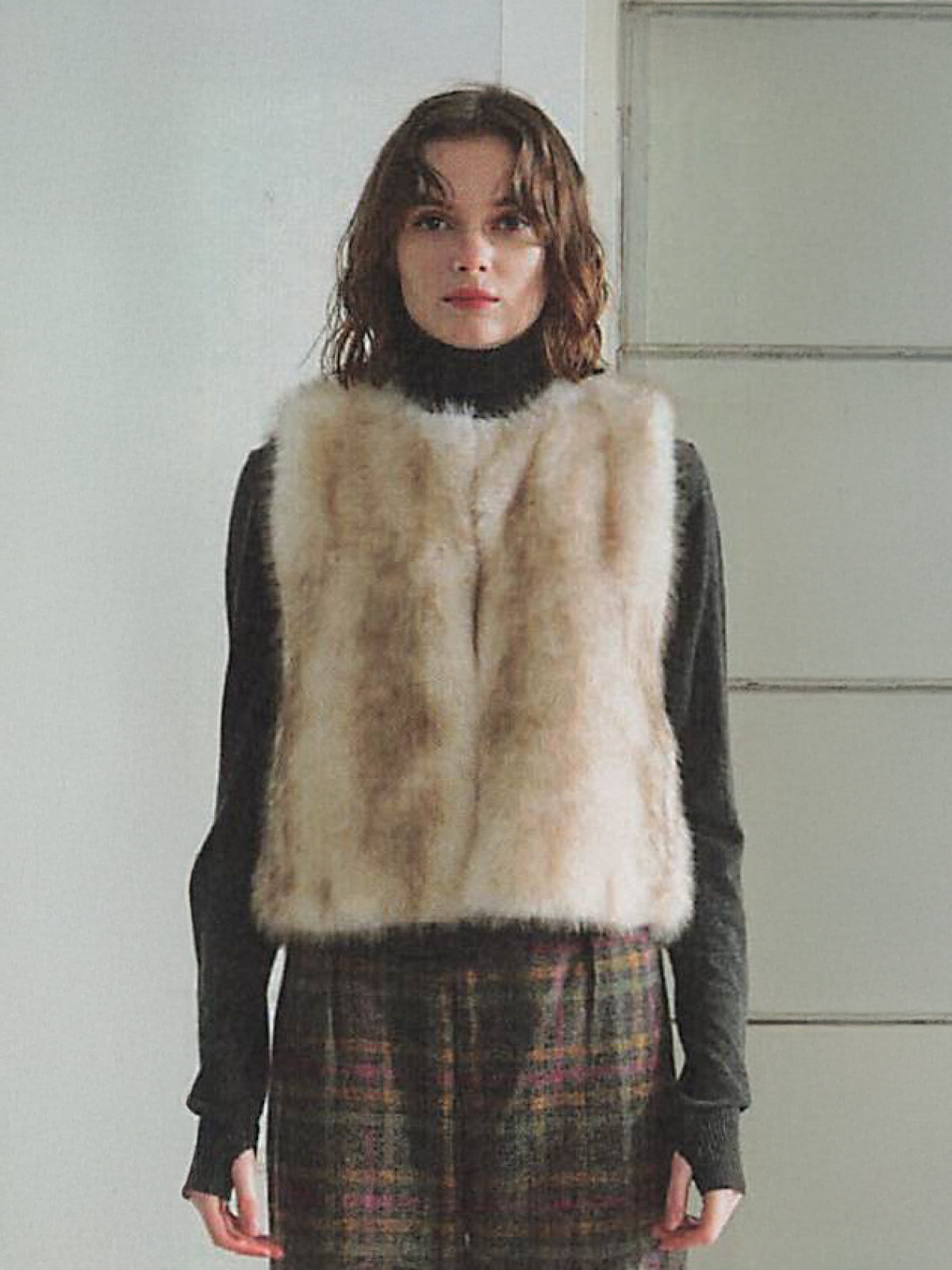 エレガントな印象のある柄入りのファーですがコンパクトなボディのベストにすることで洗練されたモダンな印象で着られる1着に仕上げました。
