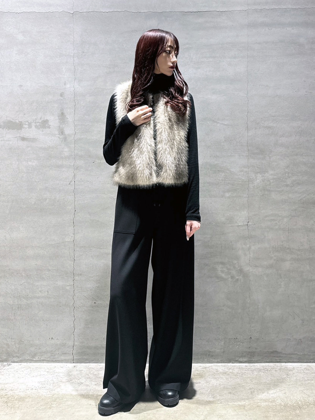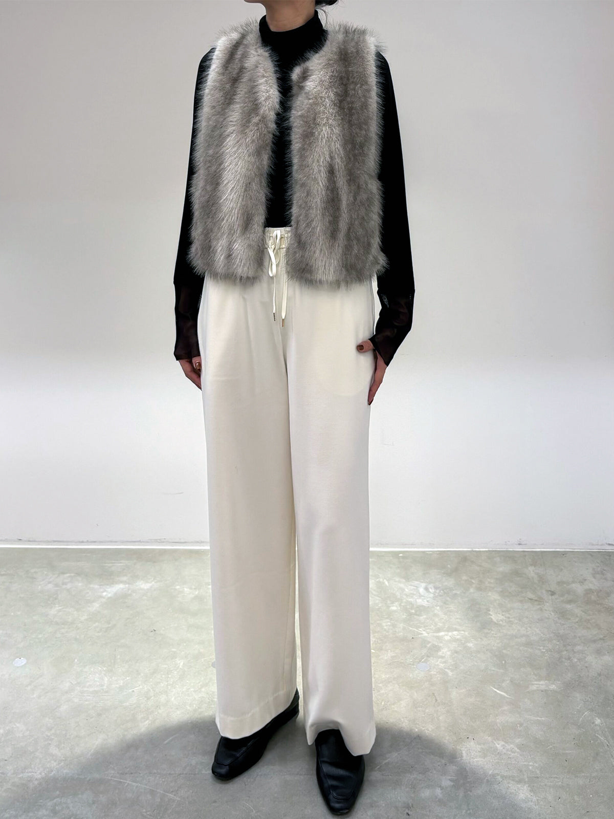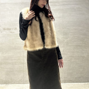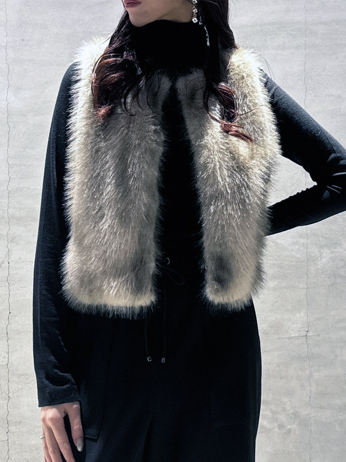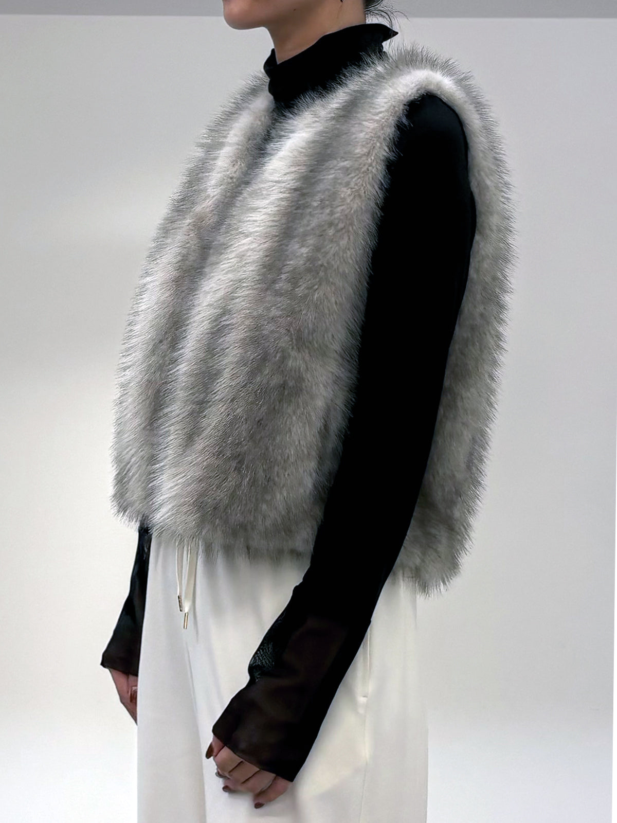エレガントな印象のある柄入りのファーですがコンパクトなボディのベストにすることで洗練されたモダンな印象で着られる1着に仕上げました。