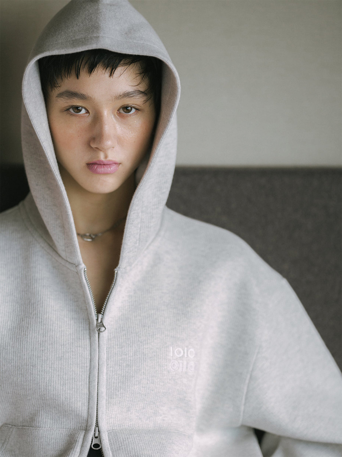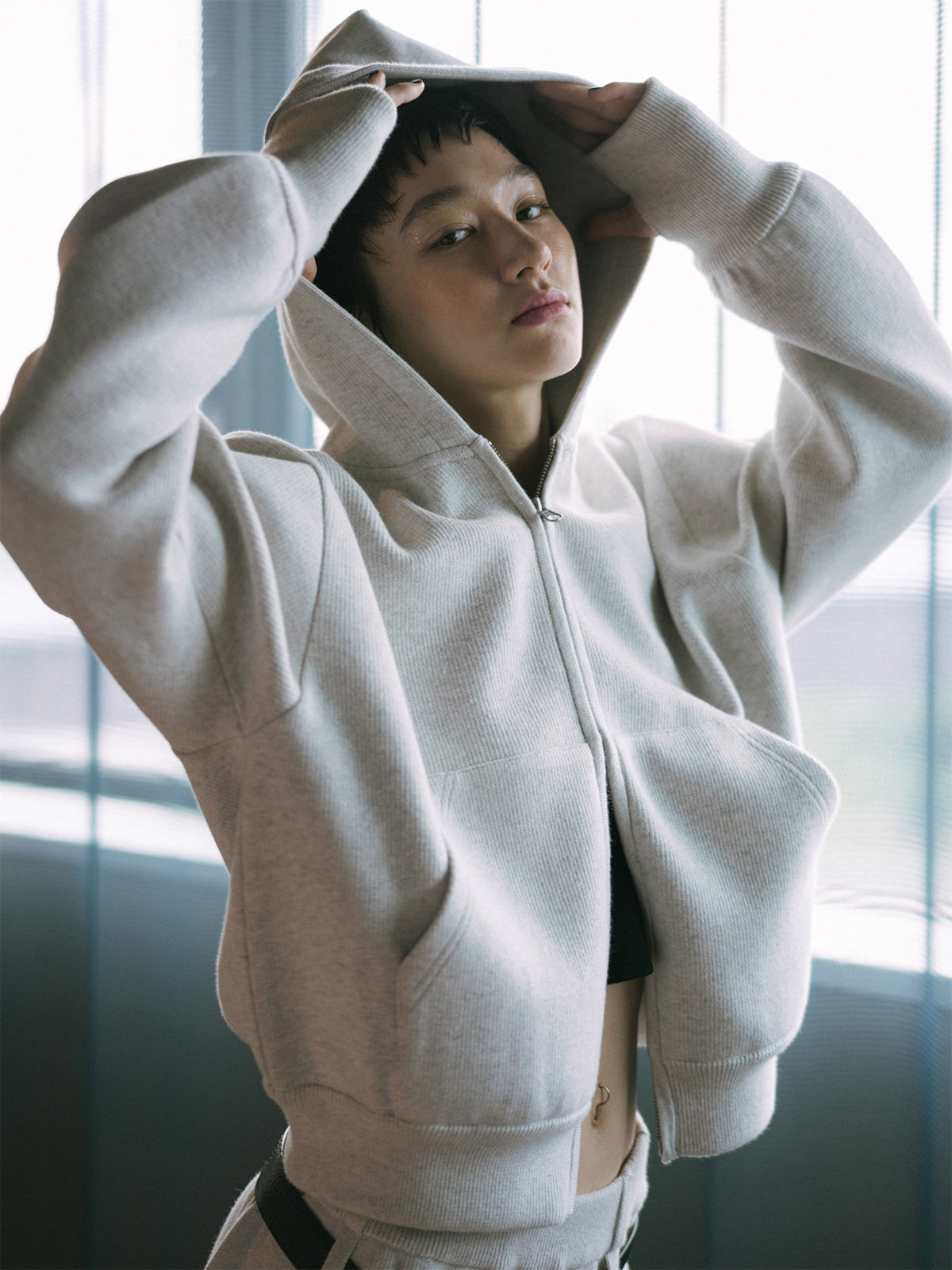あえてフードは少し大きめですが、編み地を変えて膨らみ過ぎないよう大人っぽい仕上がりです。