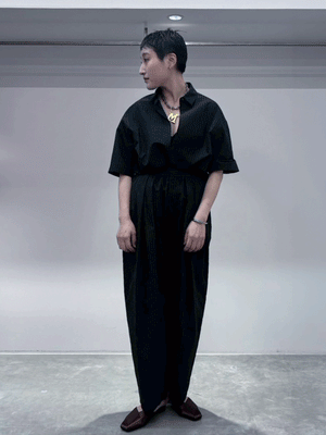 生地の上質さを活かすためミニマルに仕上げたトップス。袖口にギャザー切り替えを入れエレガンス感をプラスしました。