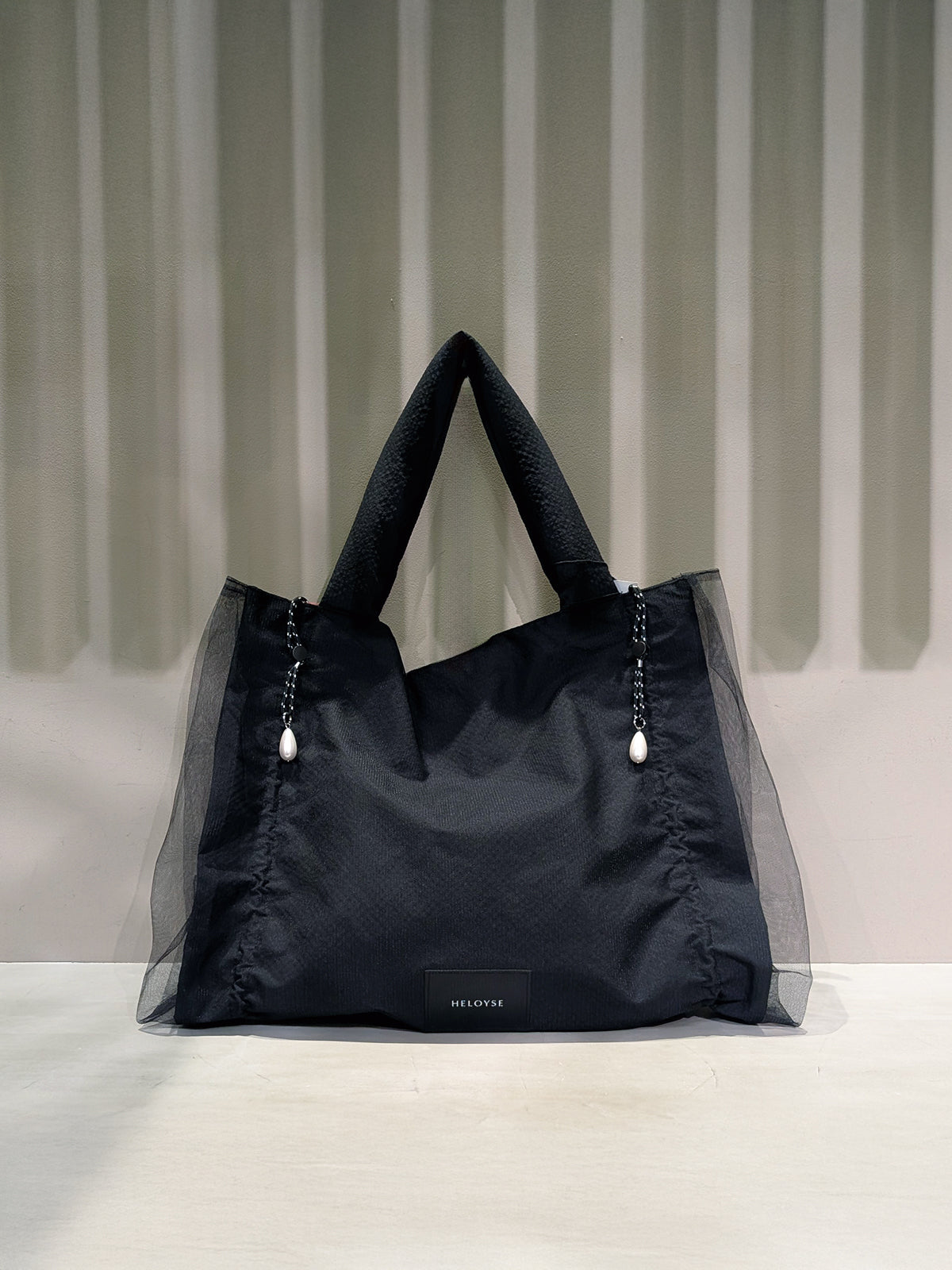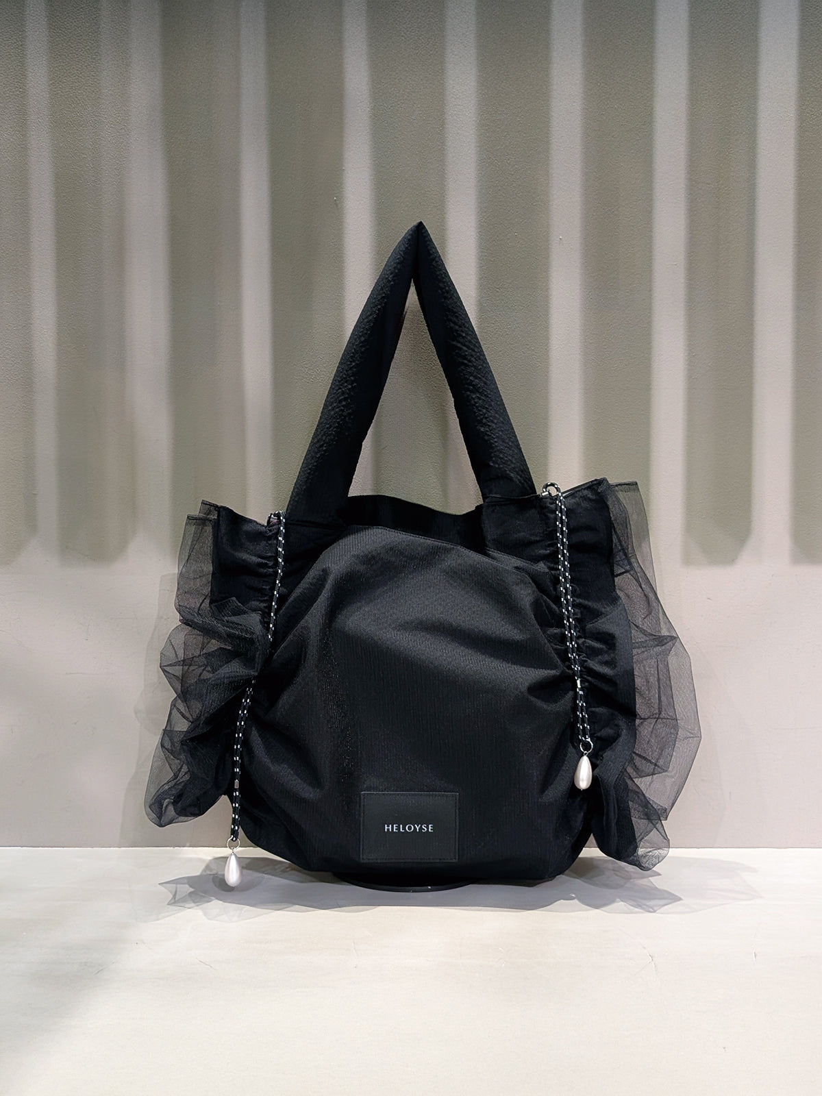 両サイドのパール付きロープを寄せるとキャンディーのような形に変化でき、サイズやデザインが調整できるキャンディトート。