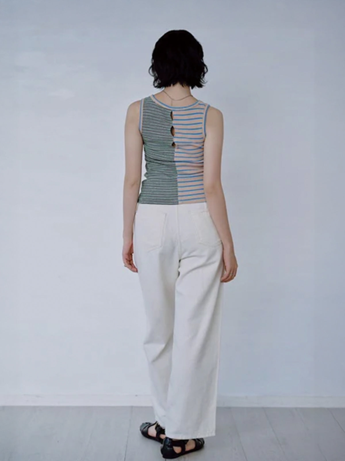 ピッチ違いのボーダーを組み合わせたリブ素材のタンクトップ。