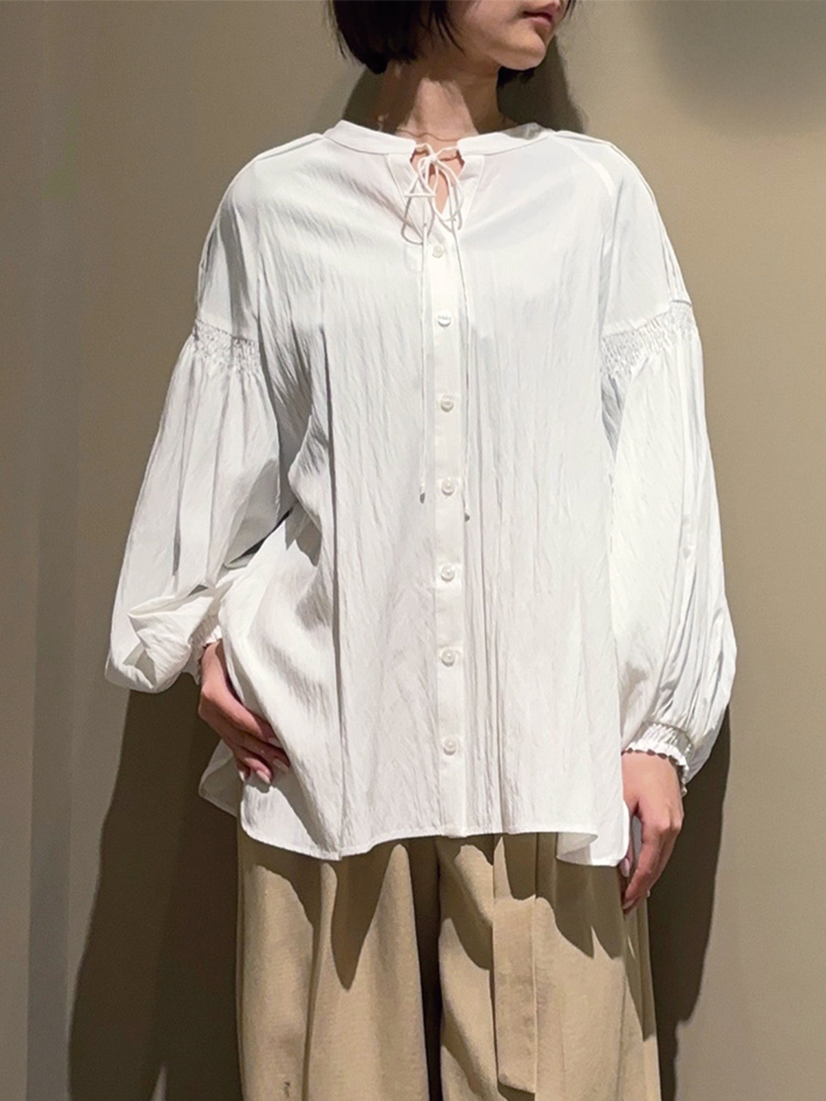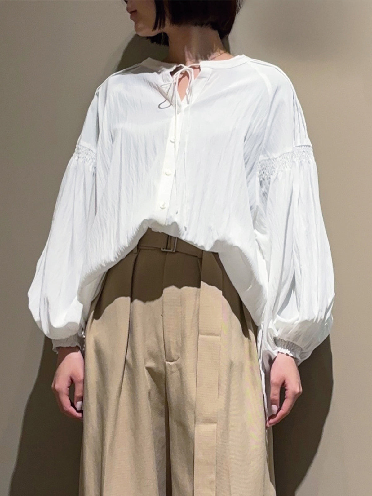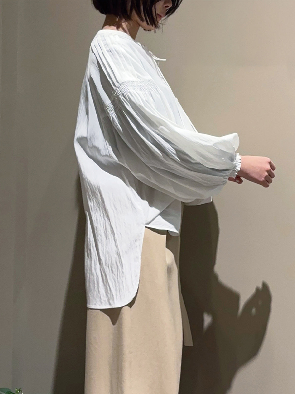 袖のピンタックとギャザーが生み出す自然なボリュームで、女性らしい柔らかさを表現したブラウス。