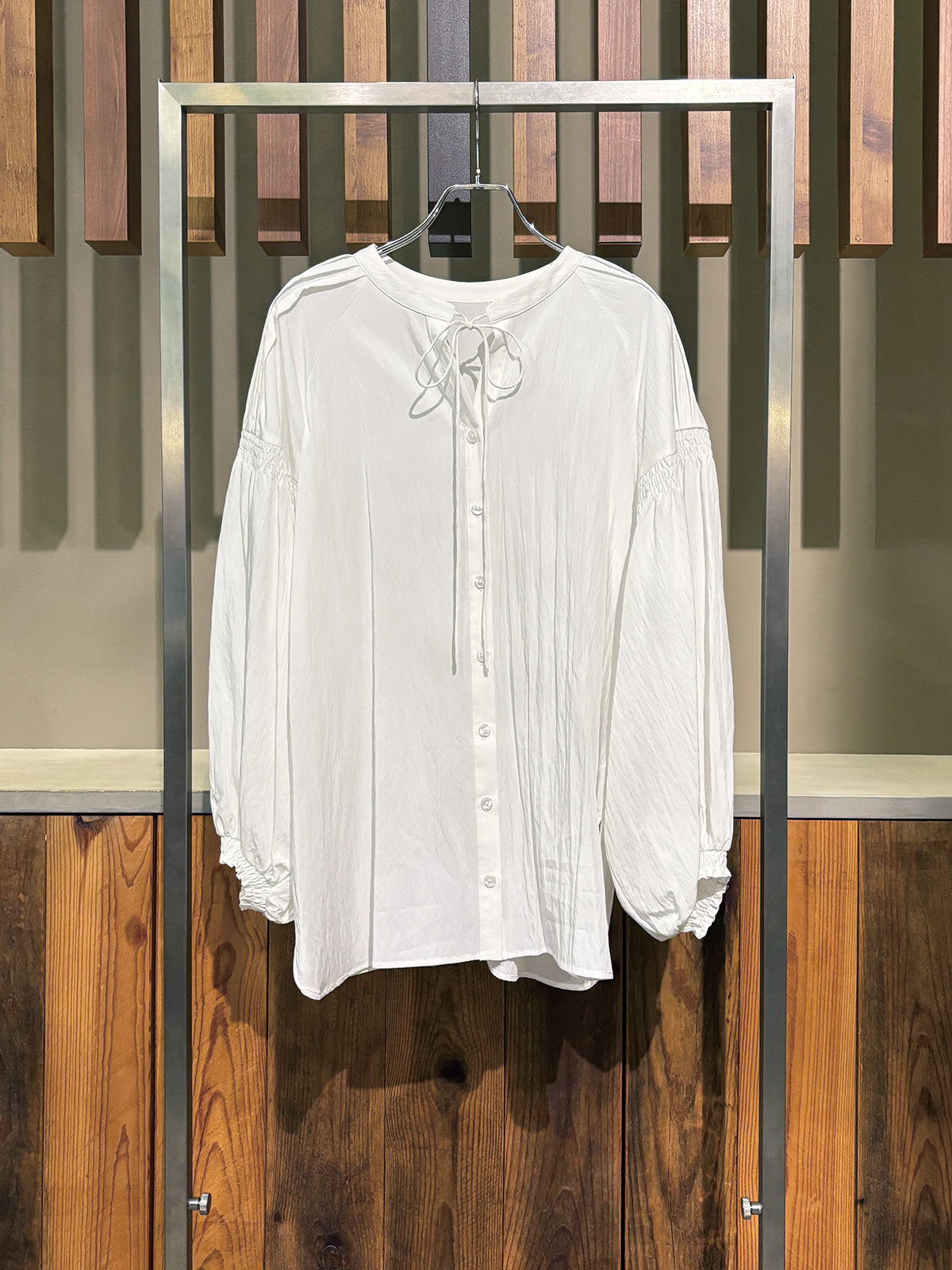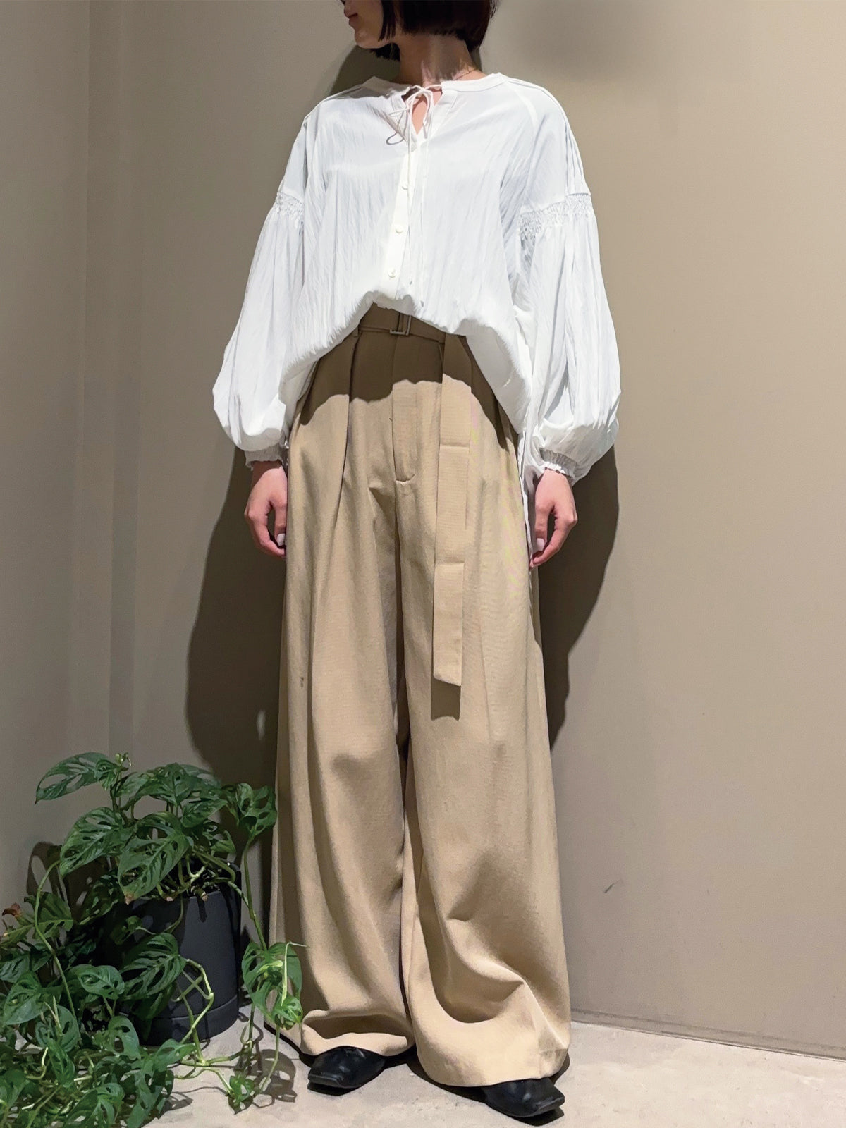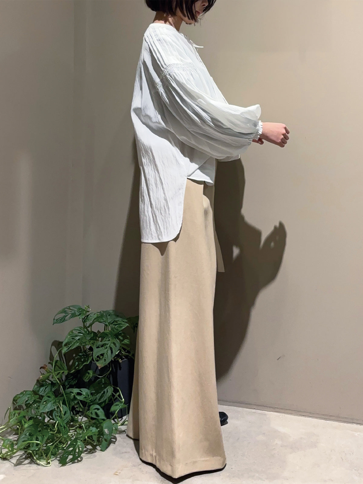 袖のピンタックとギャザーが生み出す自然なボリュームで、女性らしい柔らかさを表現したブラウス。
