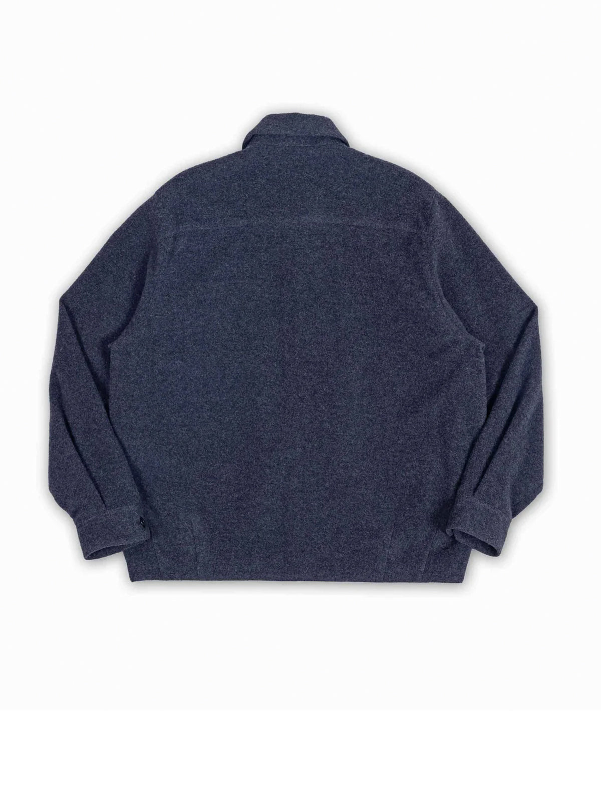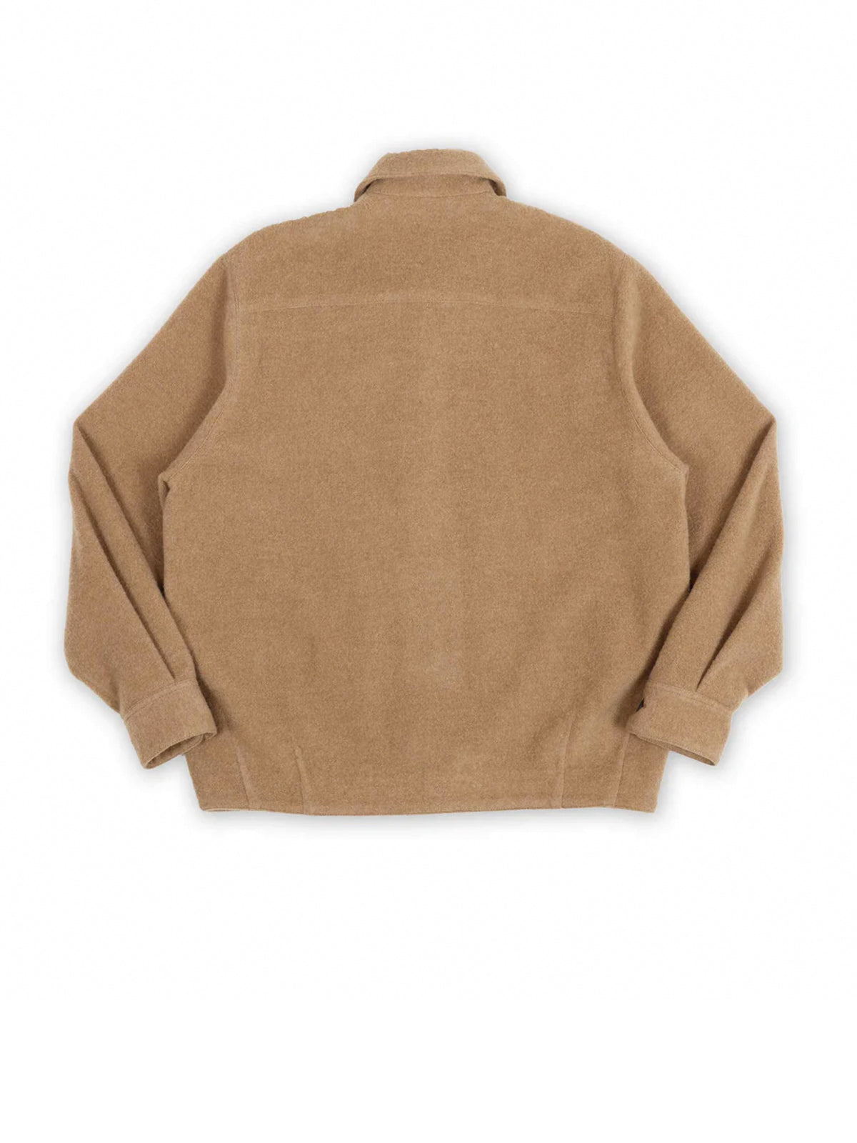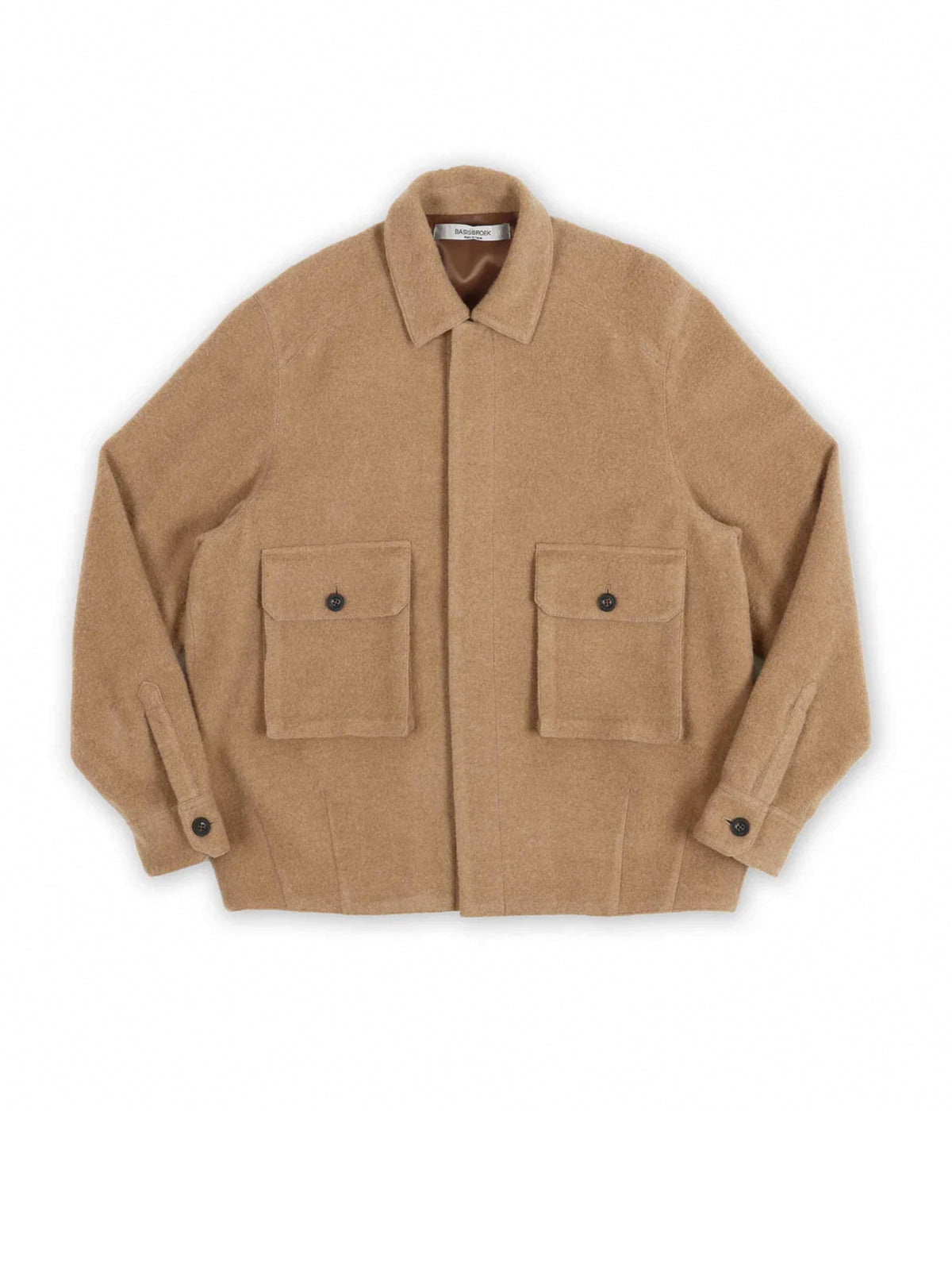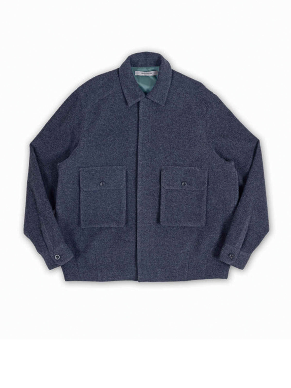 ウールとナイロンを混紡したフランネル生地に、表面を軽く毛羽立たせるナッピング調の起毛加工を施した、中肉厚で温かみのあるショートジャケット。