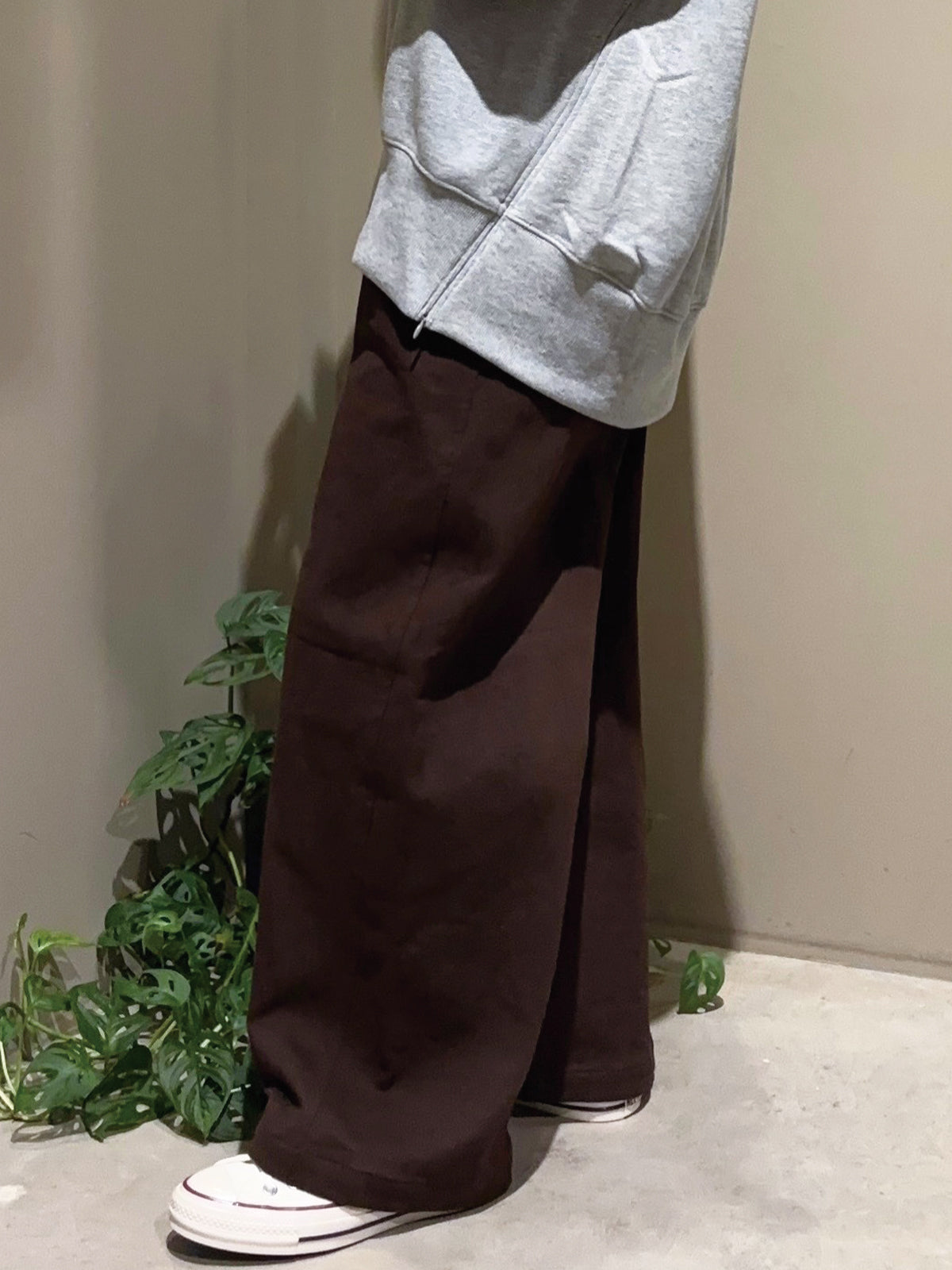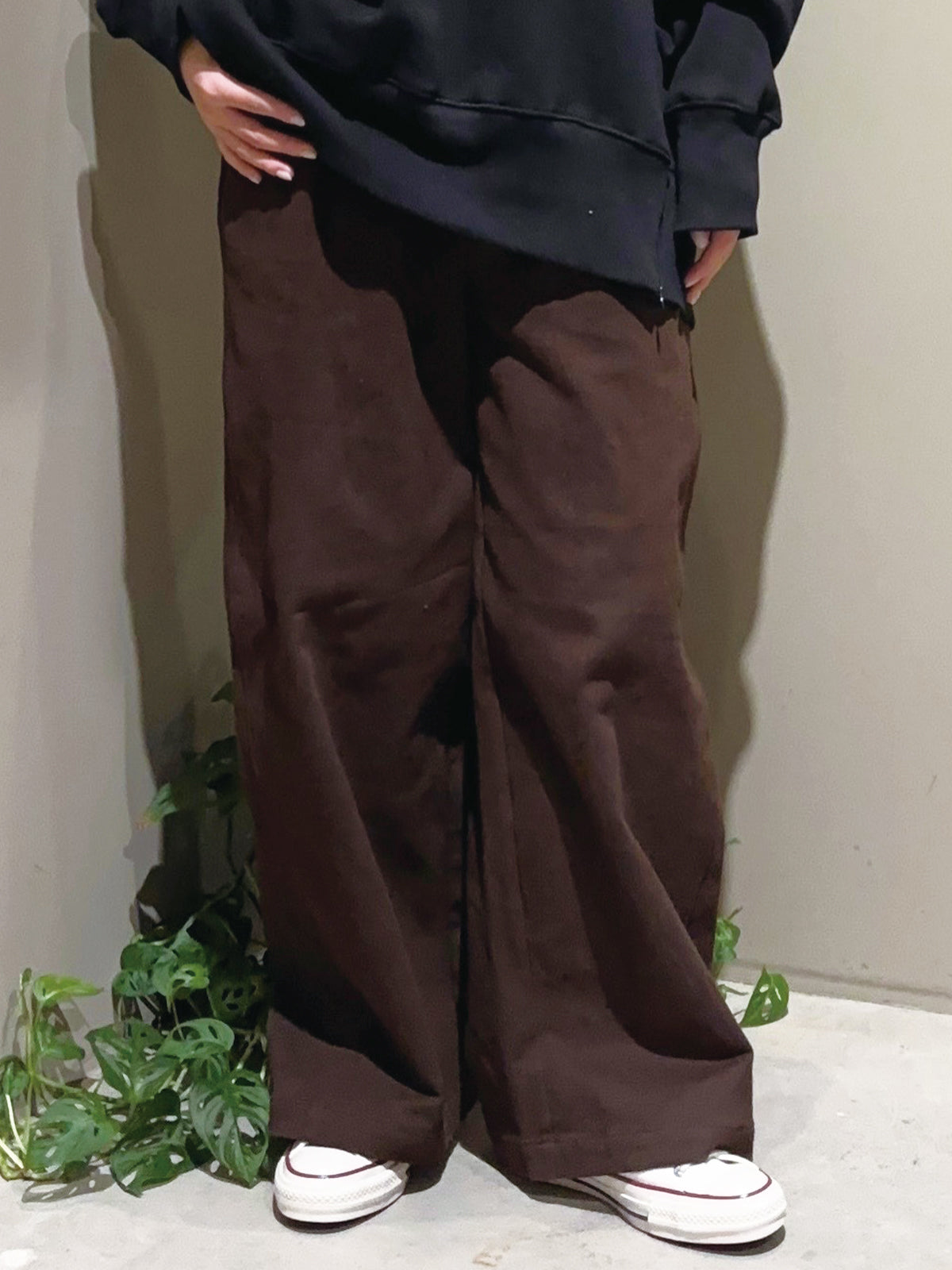 起毛感のある生地を使用、しっかりと厚みがあり立体的なシルエットと相性抜群です。後ろゴム仕様でストレスフリーな着心地です。