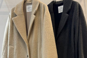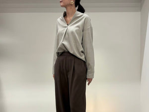 白いネップ入りの糸を編み立てたロゴニットトップス。