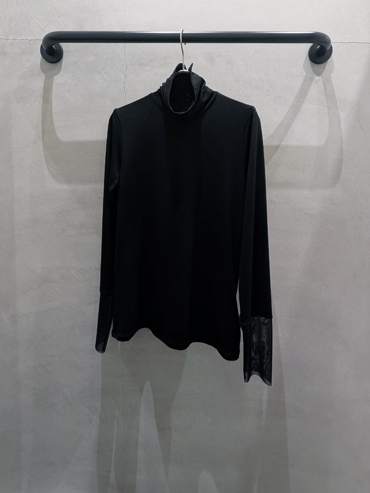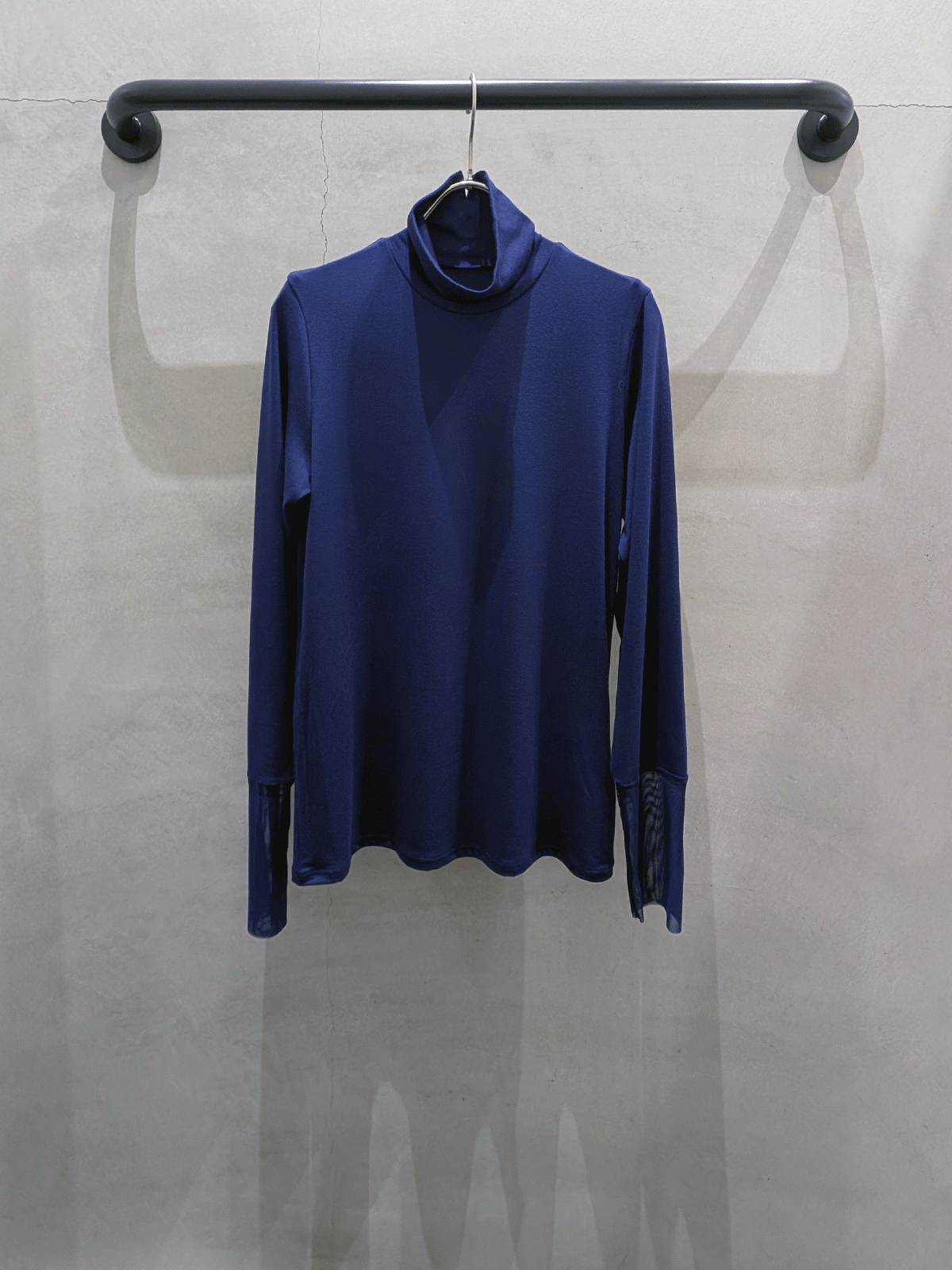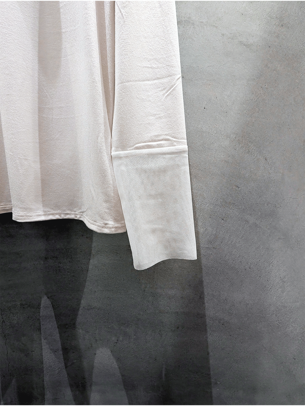 長めの袖にラメチュールを切り替えたトレンディなデザインで、バックネックのスリットがさりげないアクセント。
