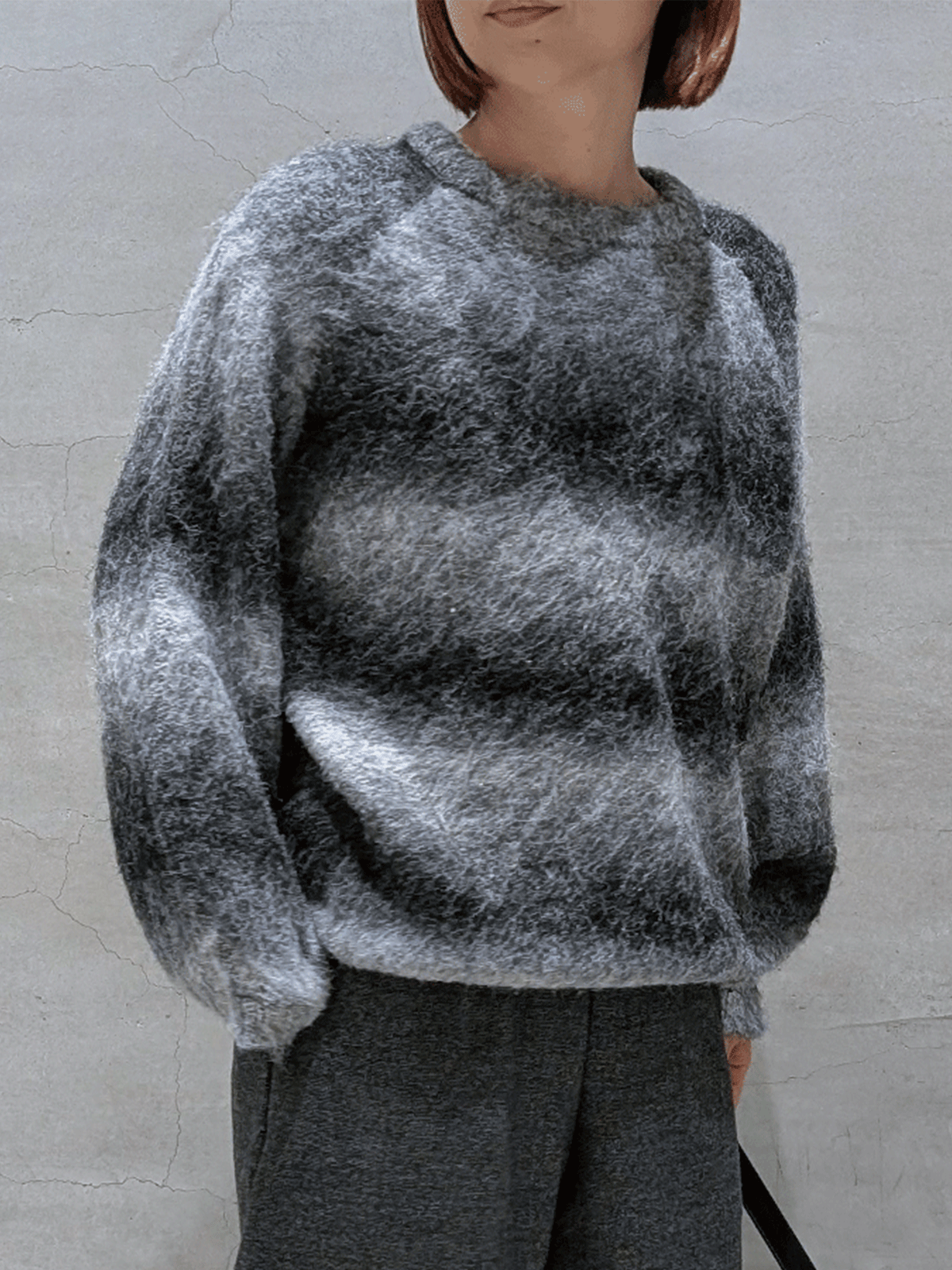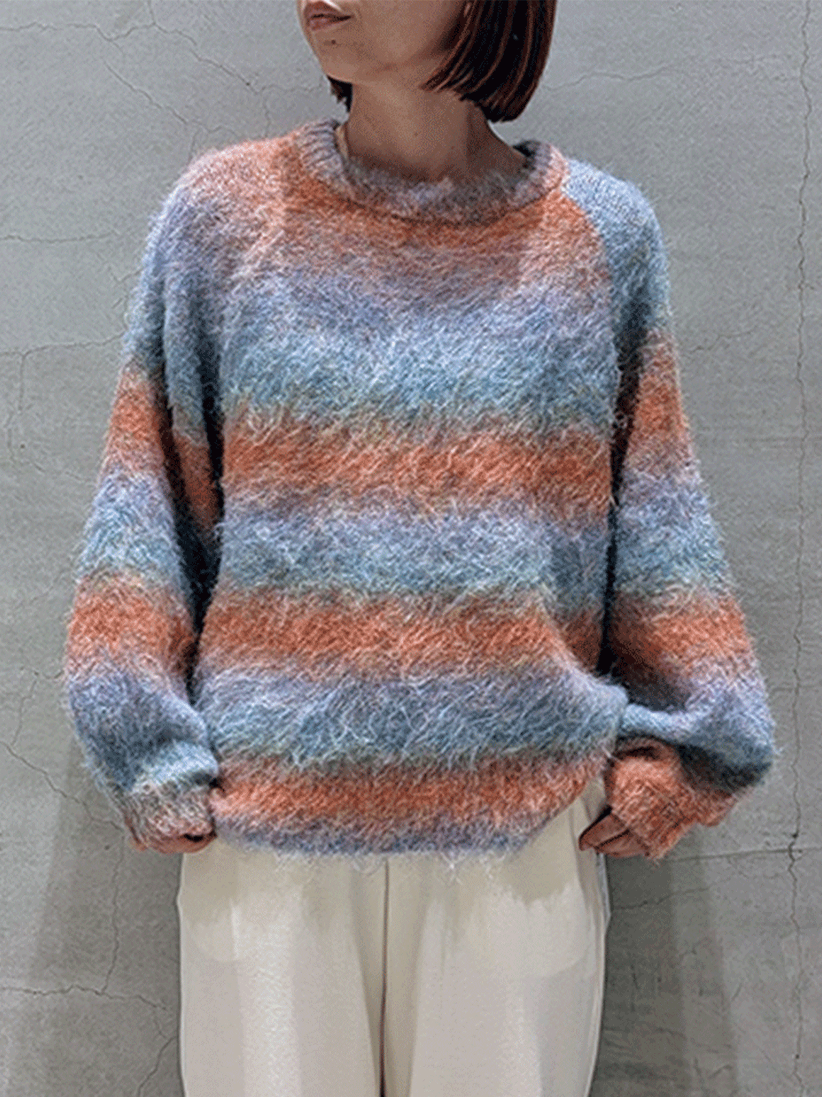 カラフルな段染めのふわふわ起毛糸をしようした、ラグラン袖ニットチュニック。