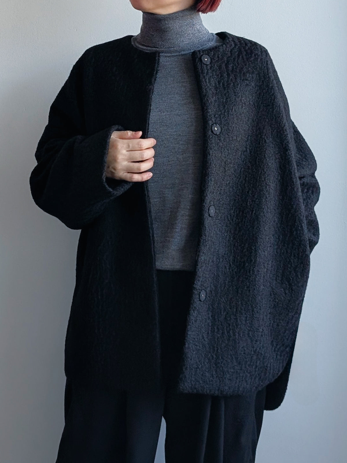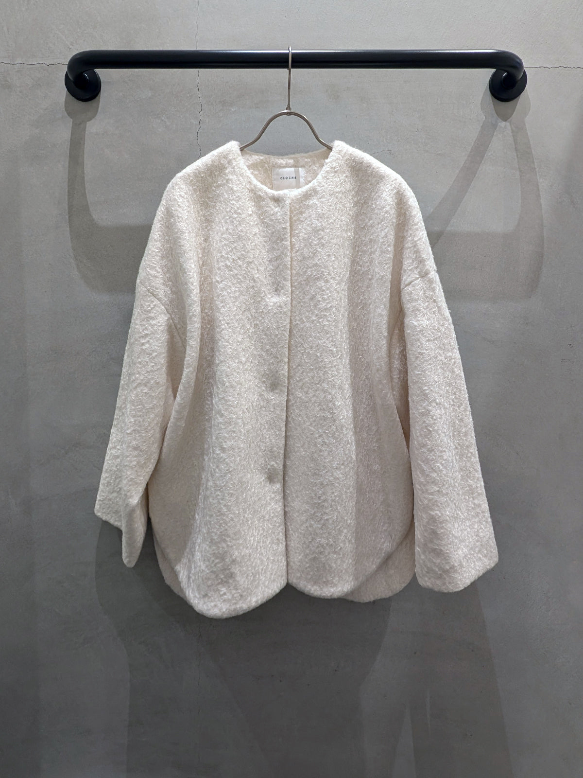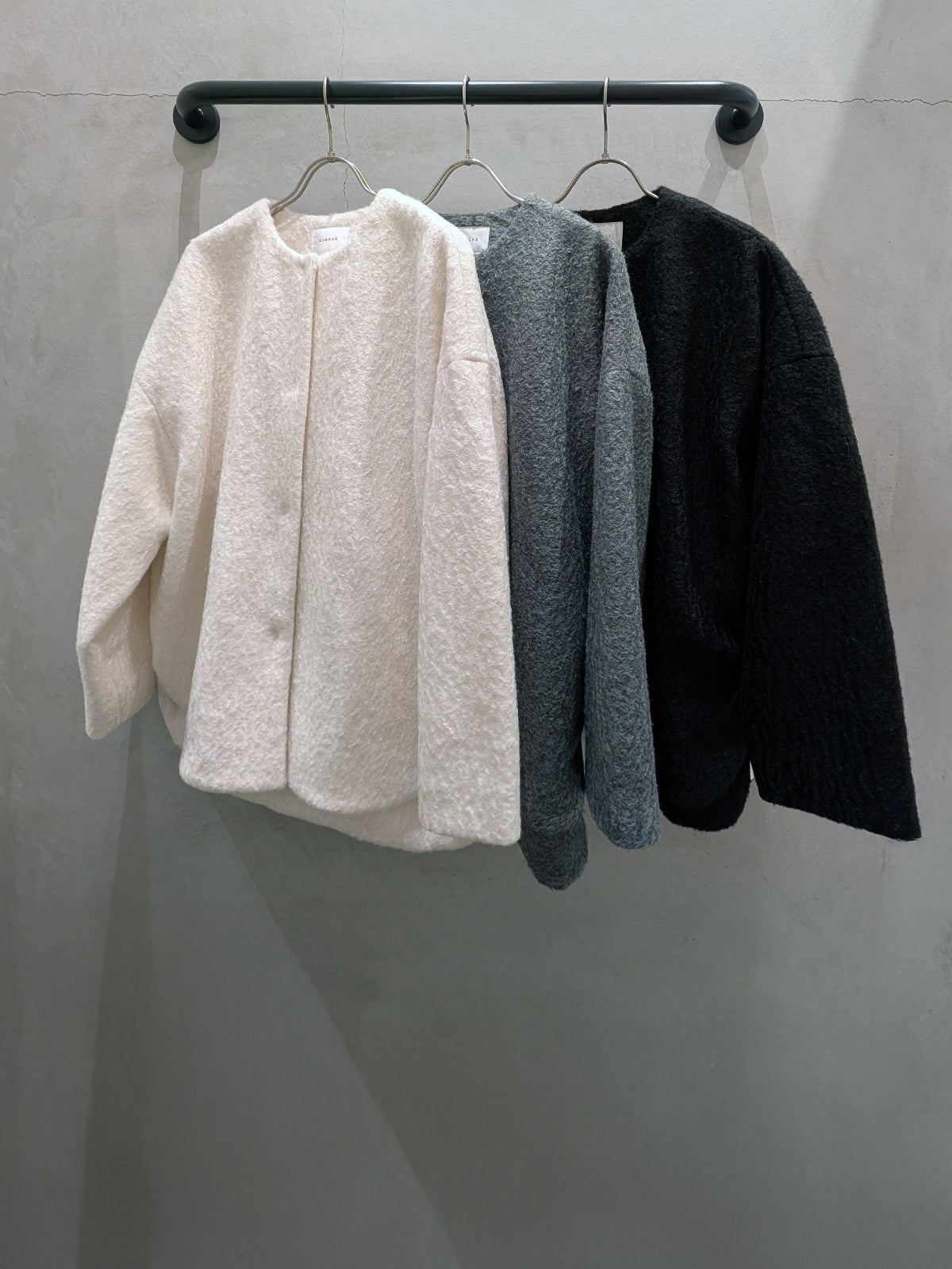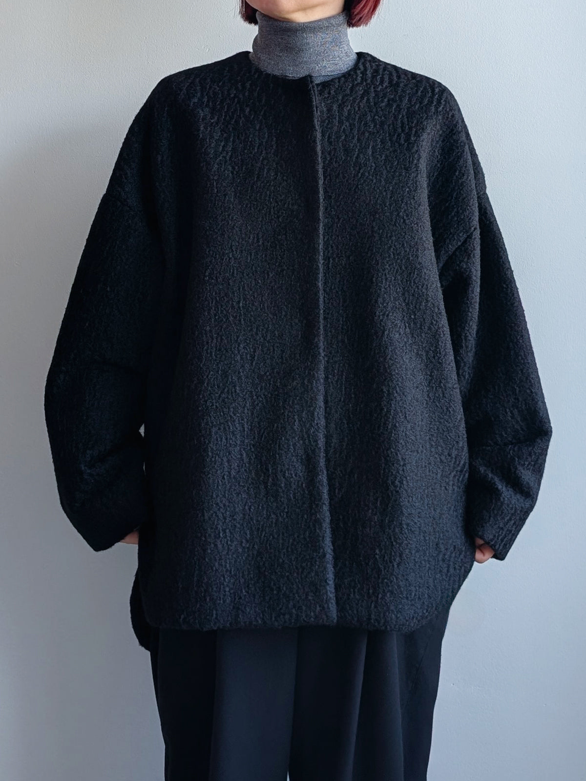 ブークレ素材が可愛いノーカラーデザインのコート。