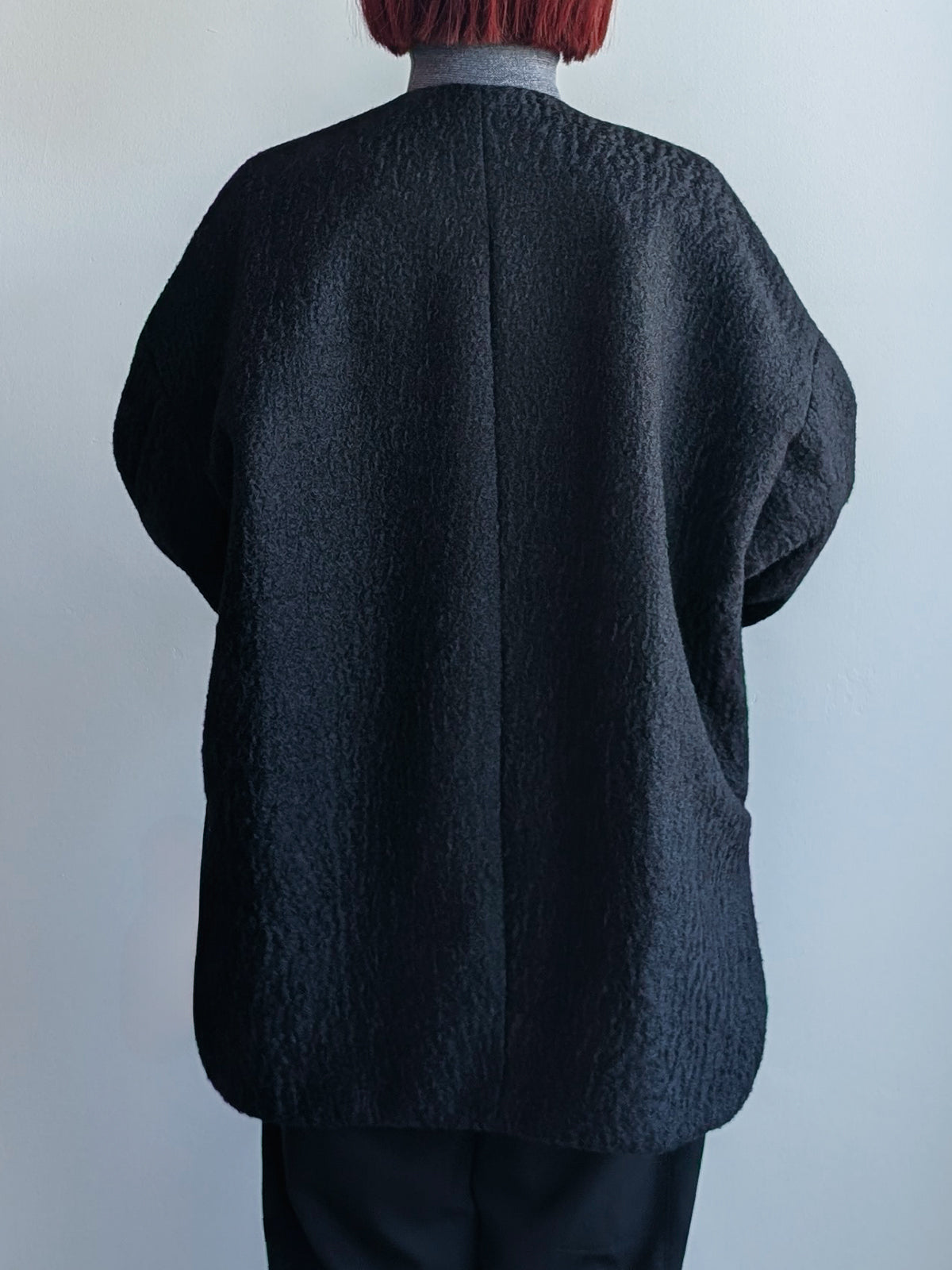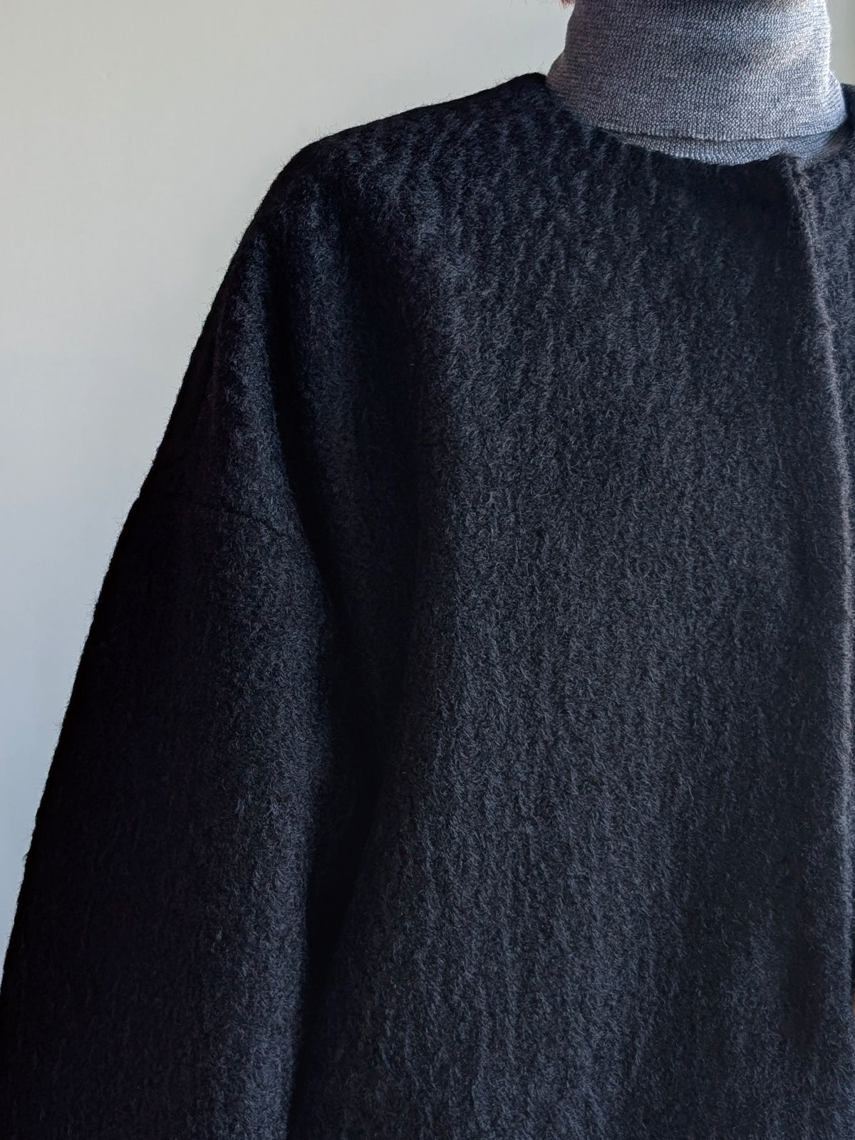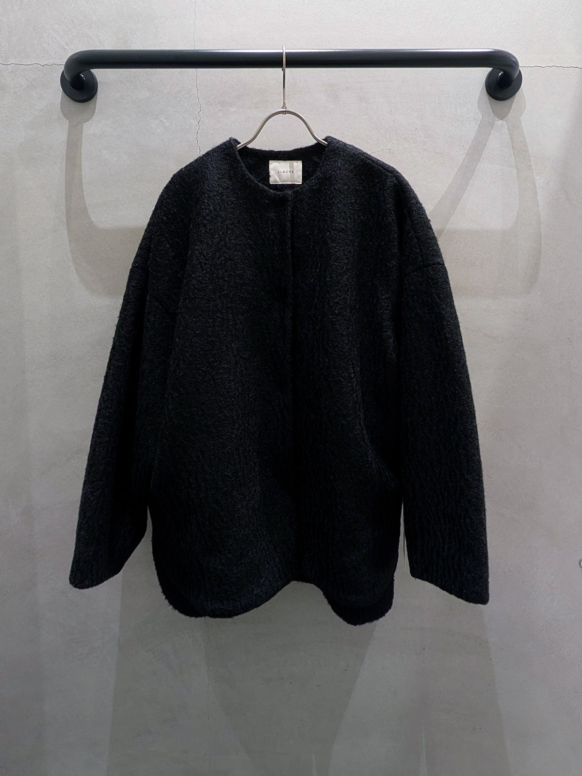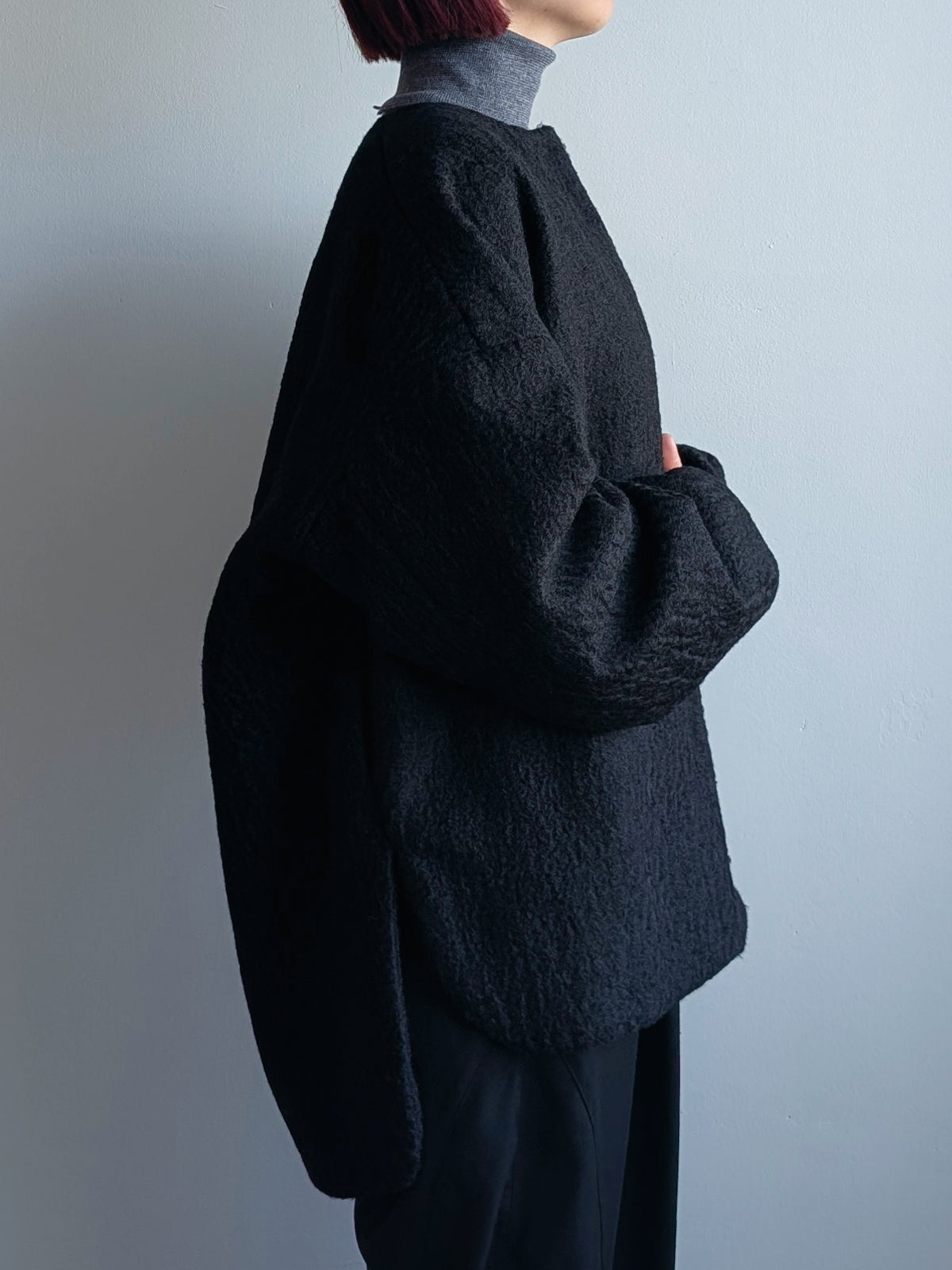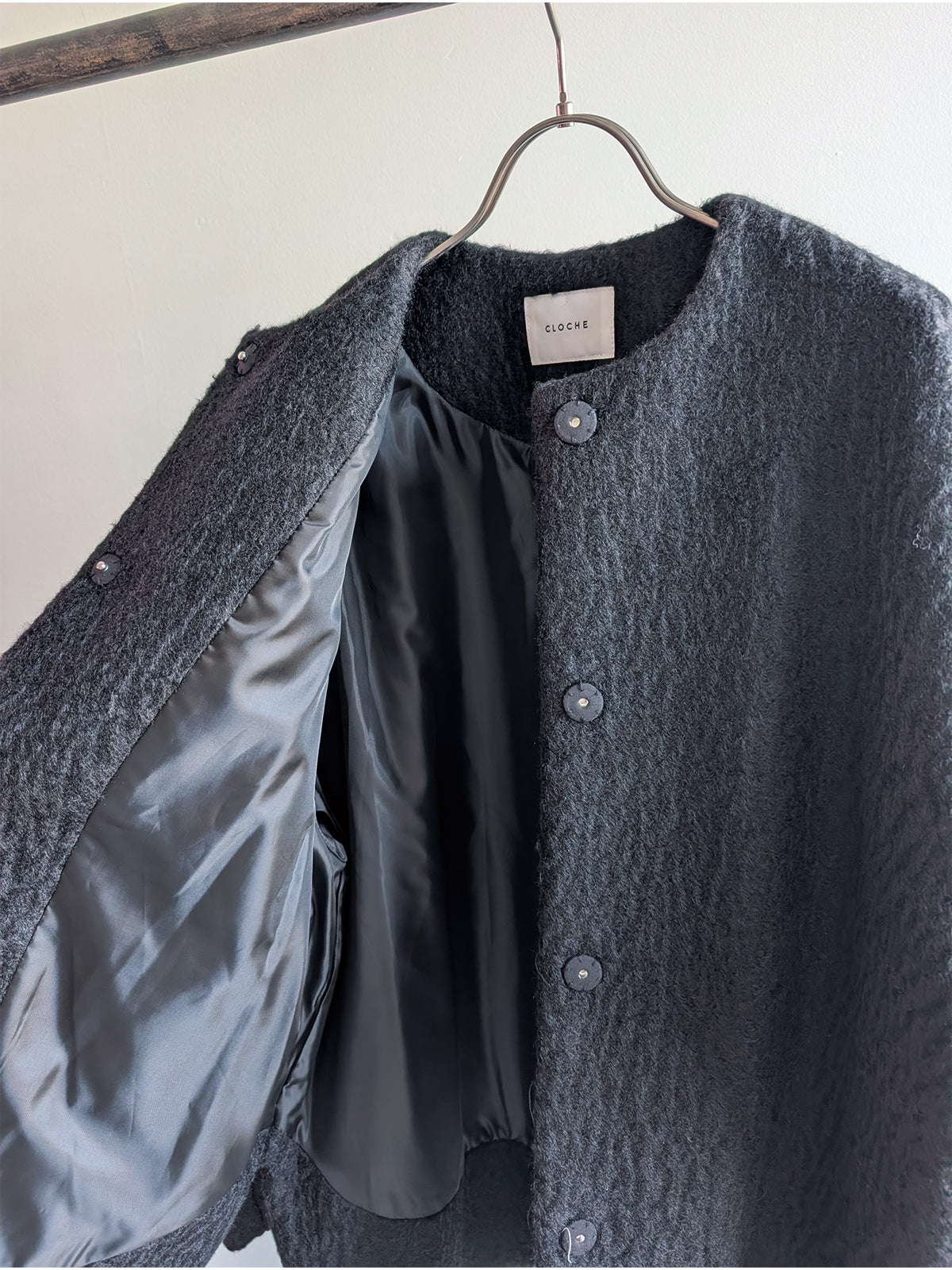 ブークレ素材が可愛いノーカラーデザインのコート。