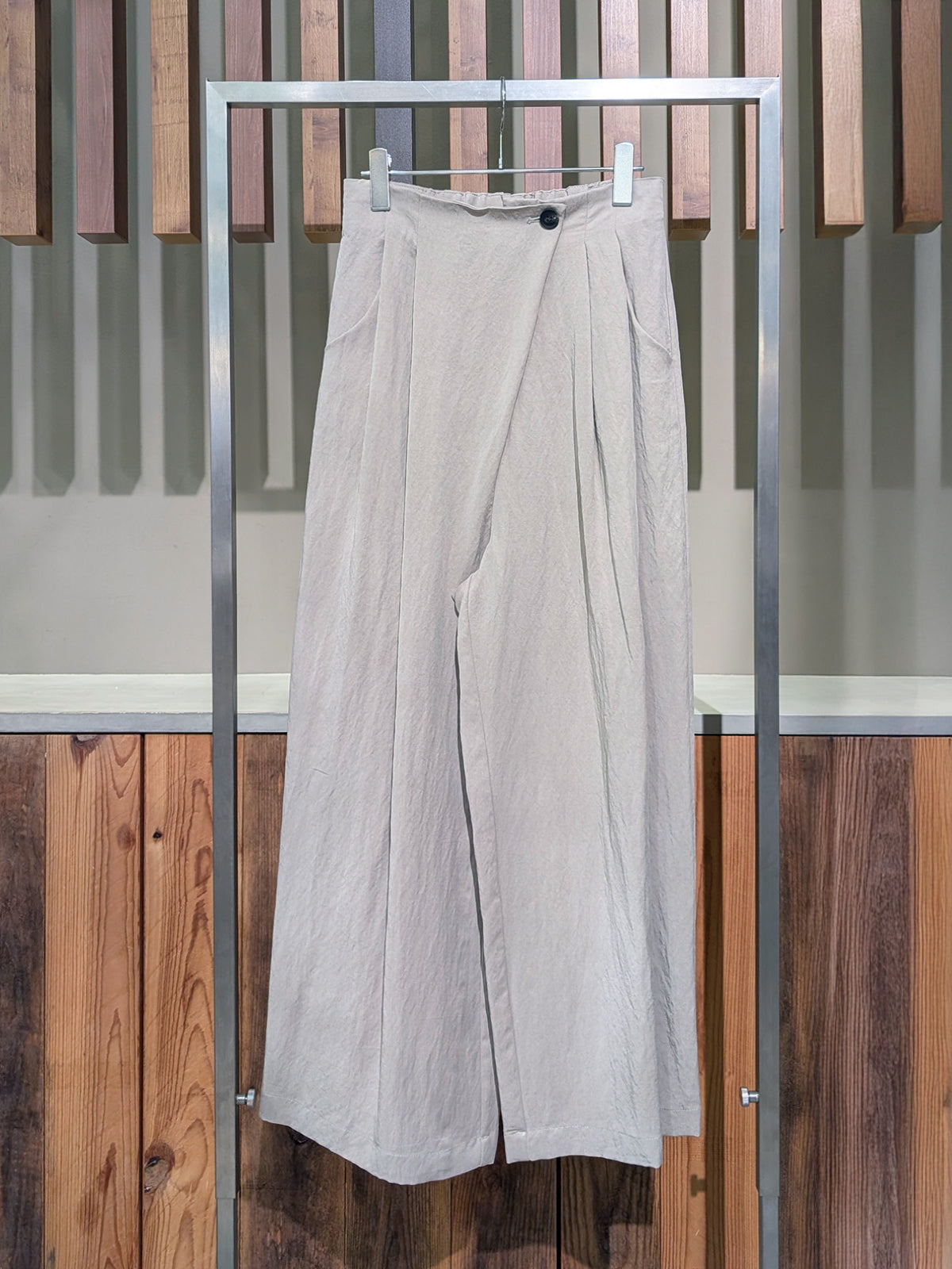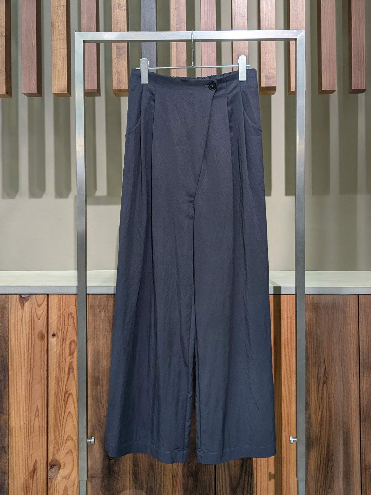 アシンメトリーなデザインがシンプルながらお洒落見えを叶えるワイドパンツ。