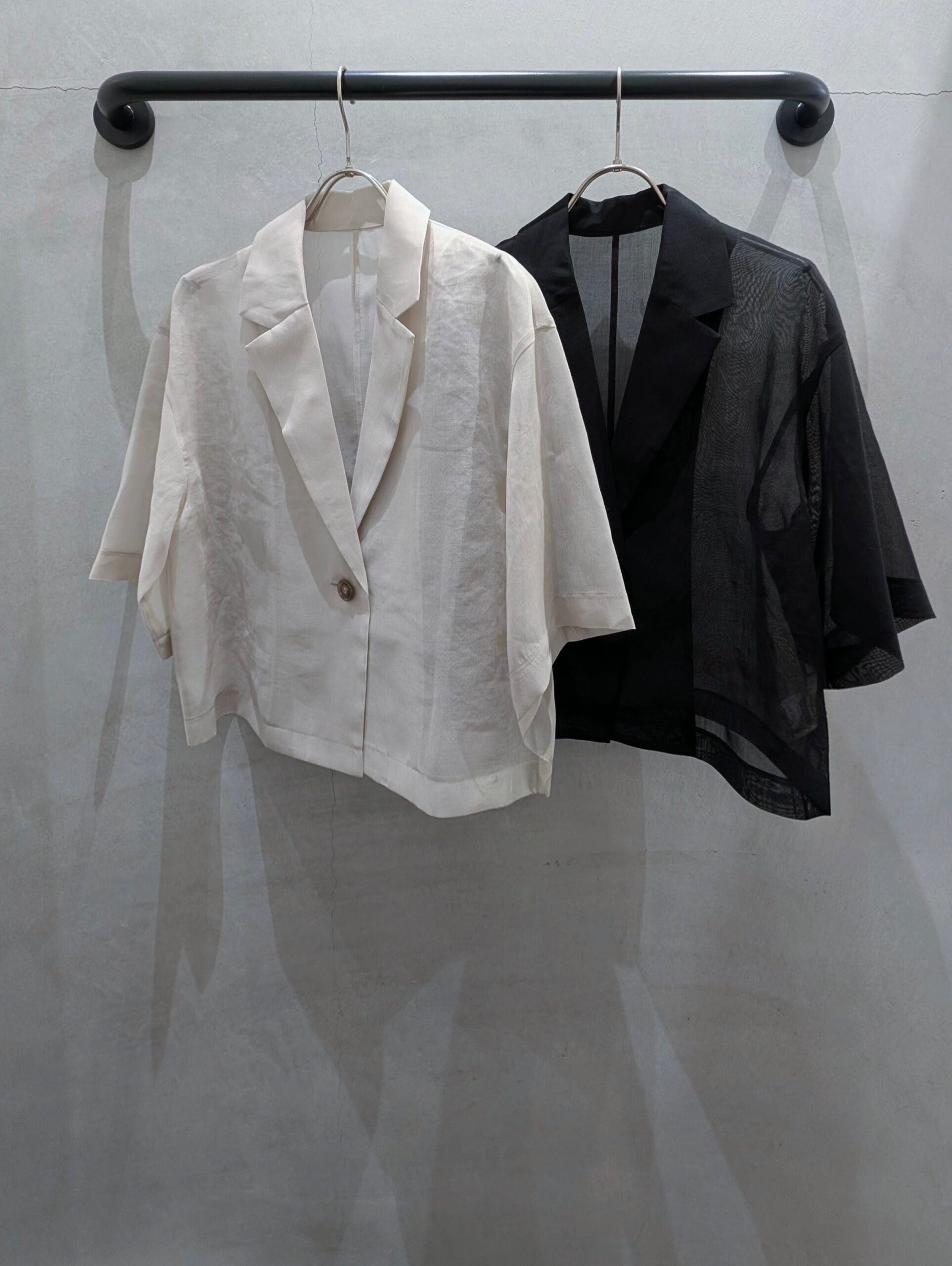 シンプルな五分袖ジャケットはトレンドのシアー素材で今年らしいアイテムに。
