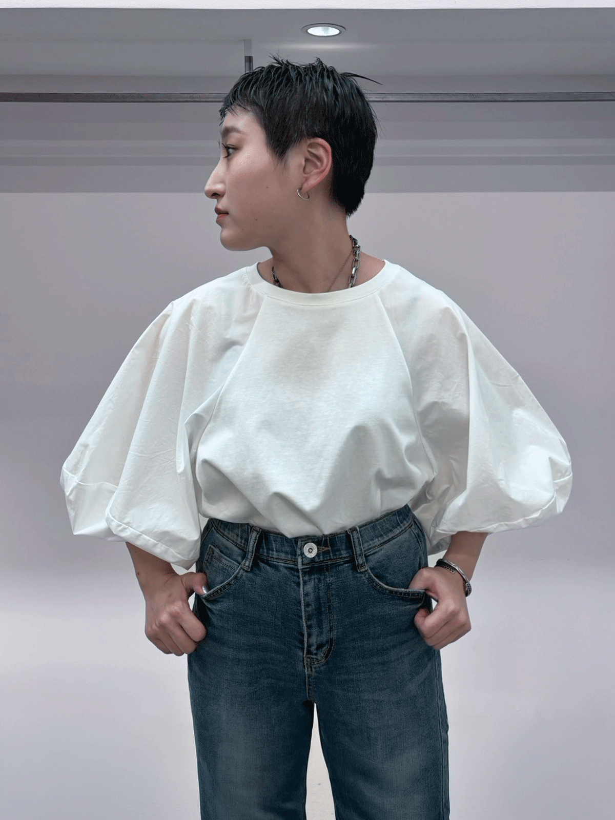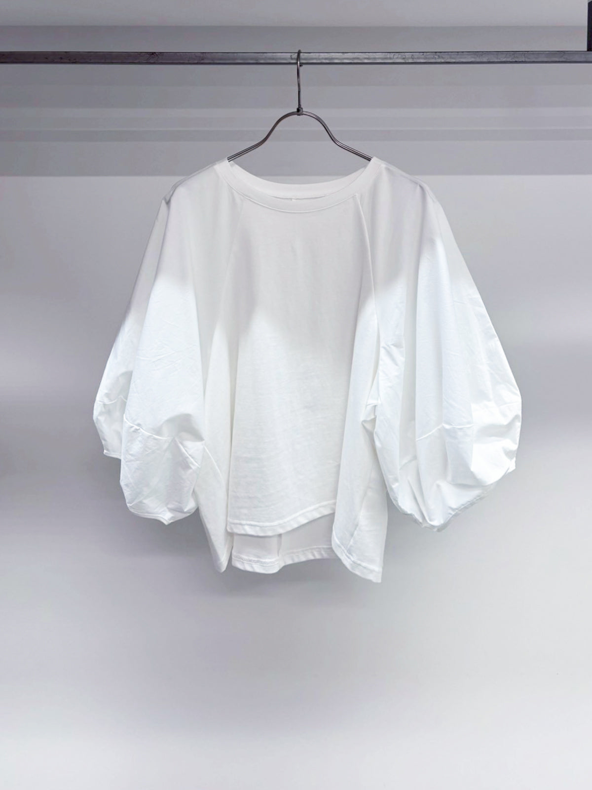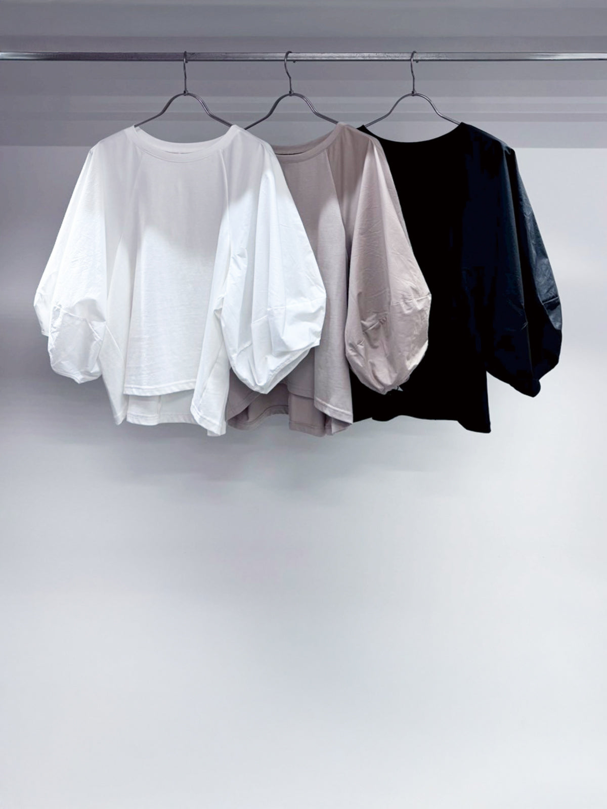 立体感のある七分袖に、身生地と袖の異素材のコントラストがポイントのトップス。