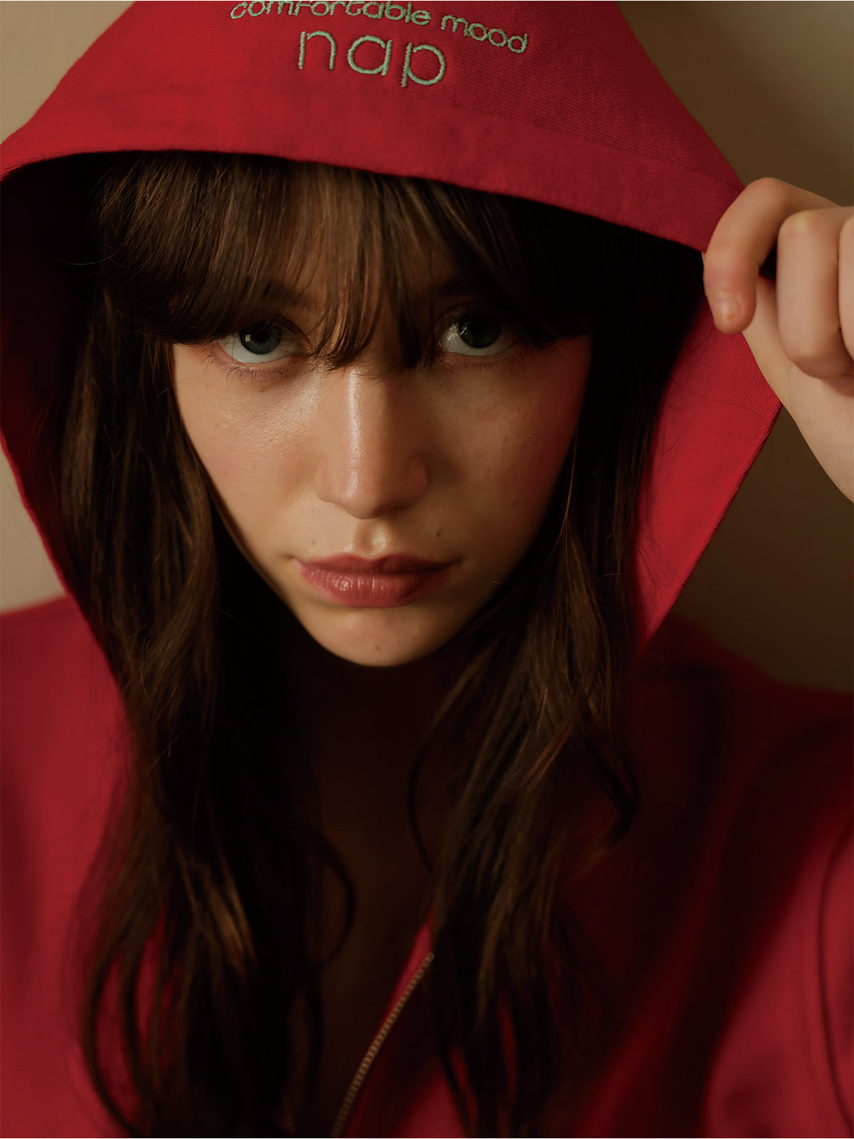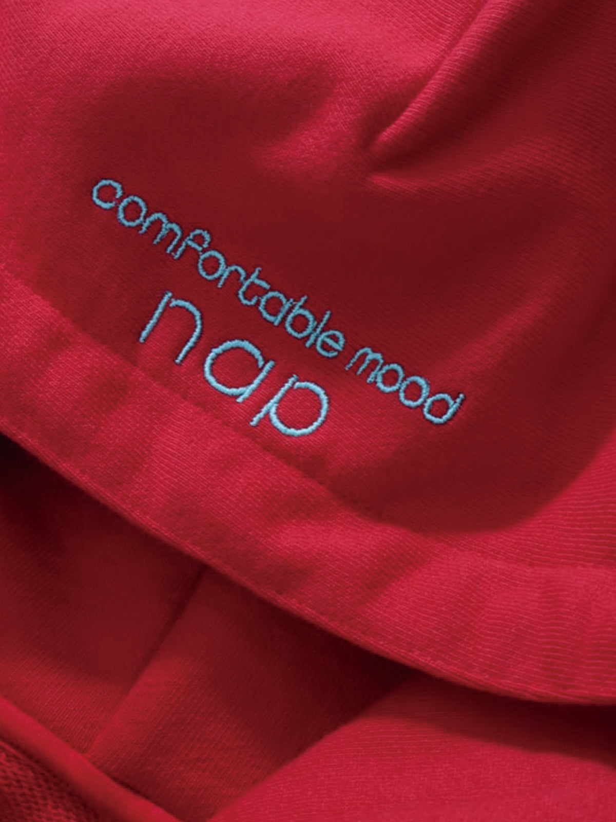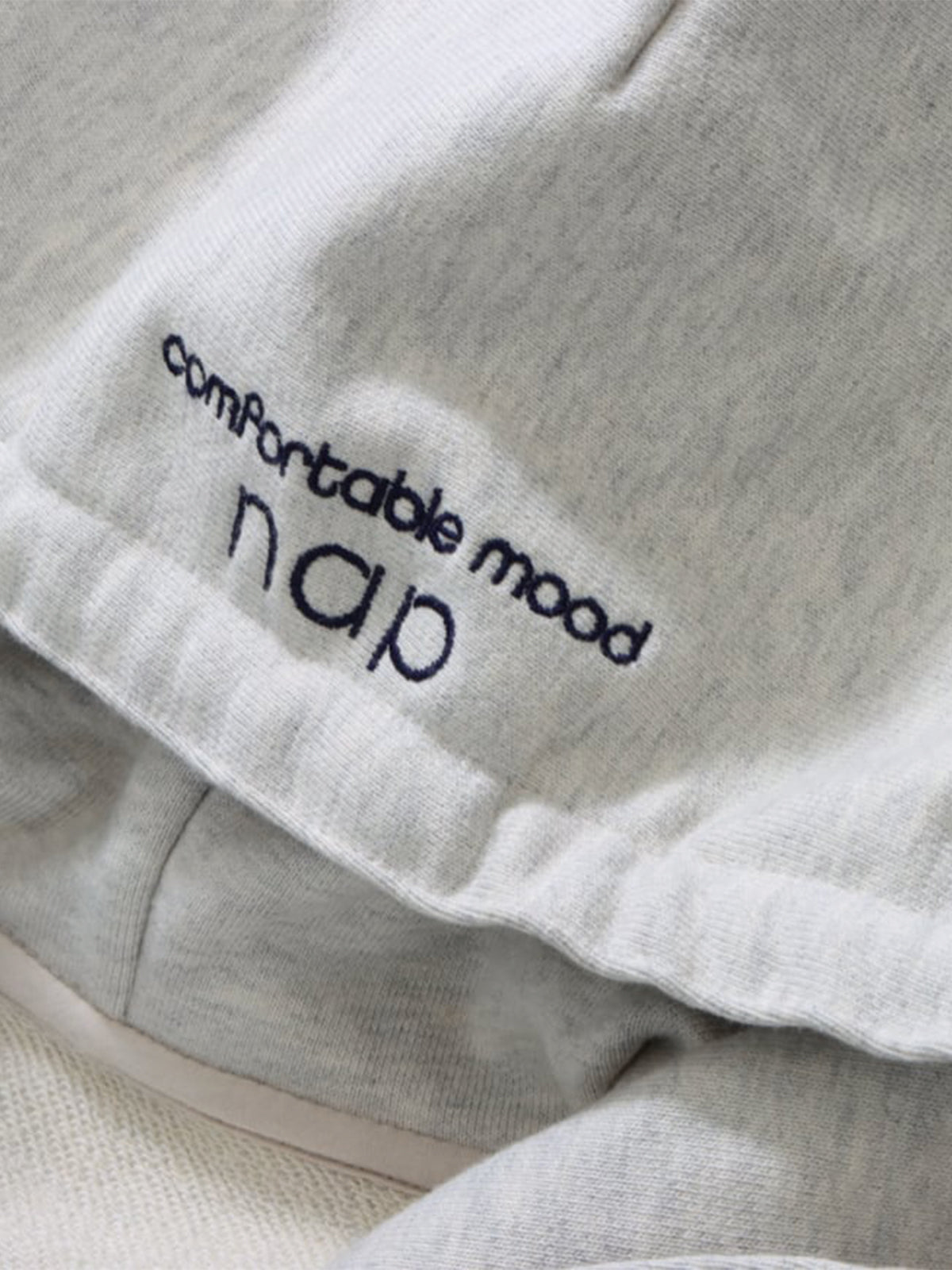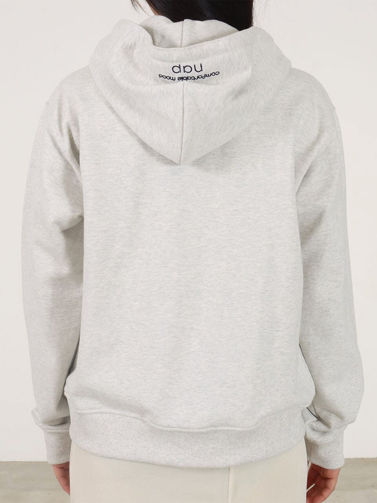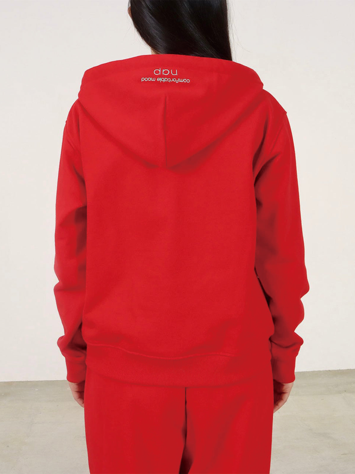 赤にはミントグリーン、オートミールにはネイビーの刺繍がフードに施され、さりげないアクセントに。