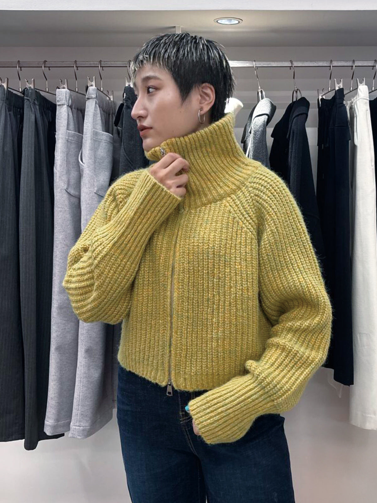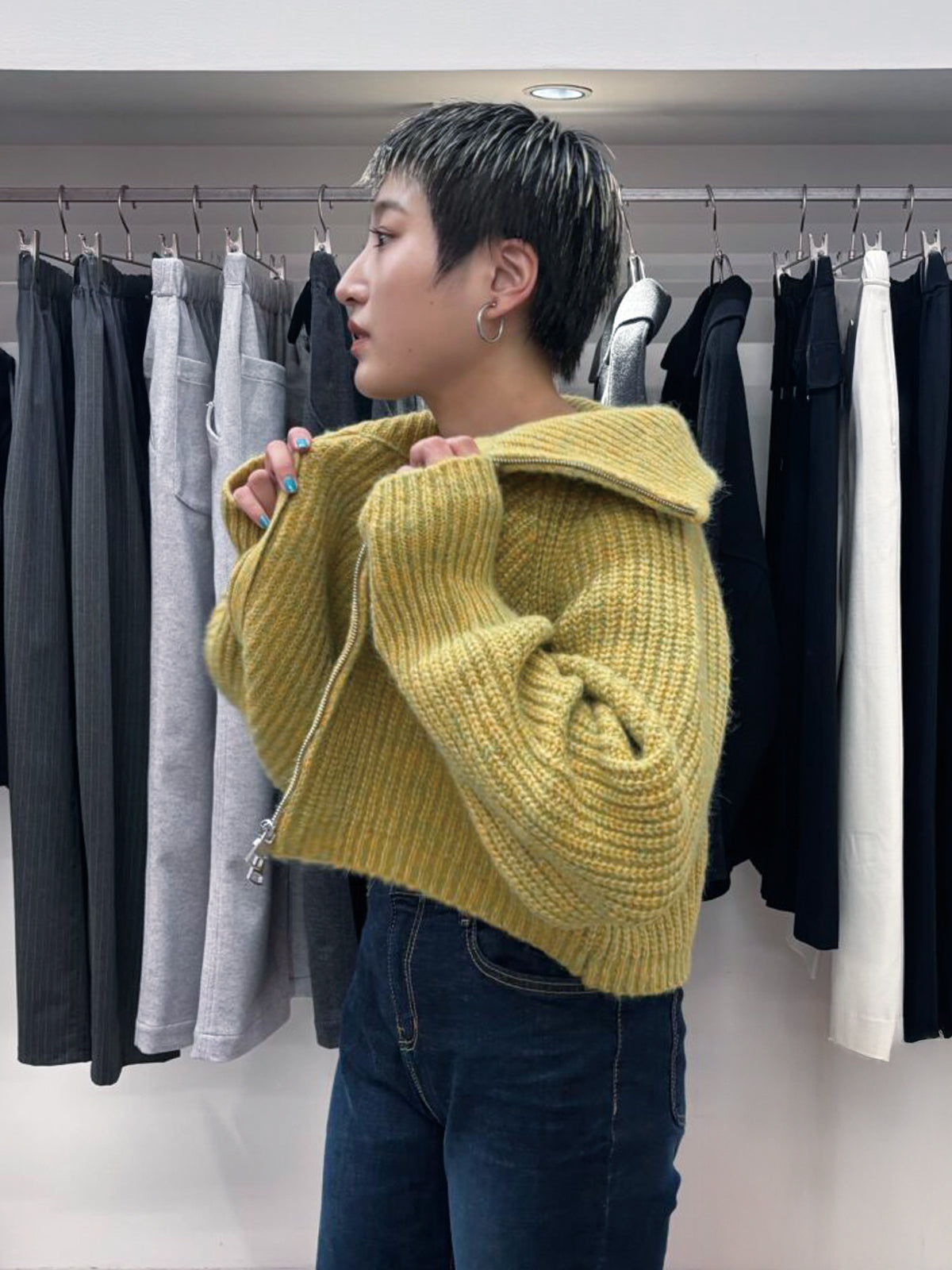 逆開ジップでフロントの開け具合を自由に楽しめ、クロップド丈なのでレイヤードスタイルにも。