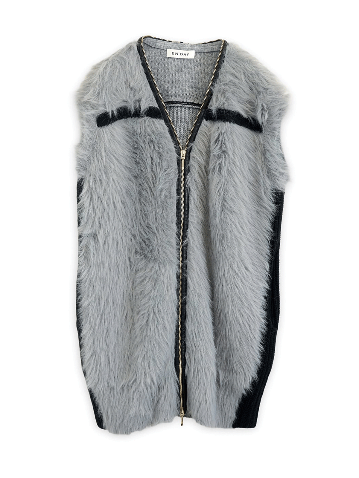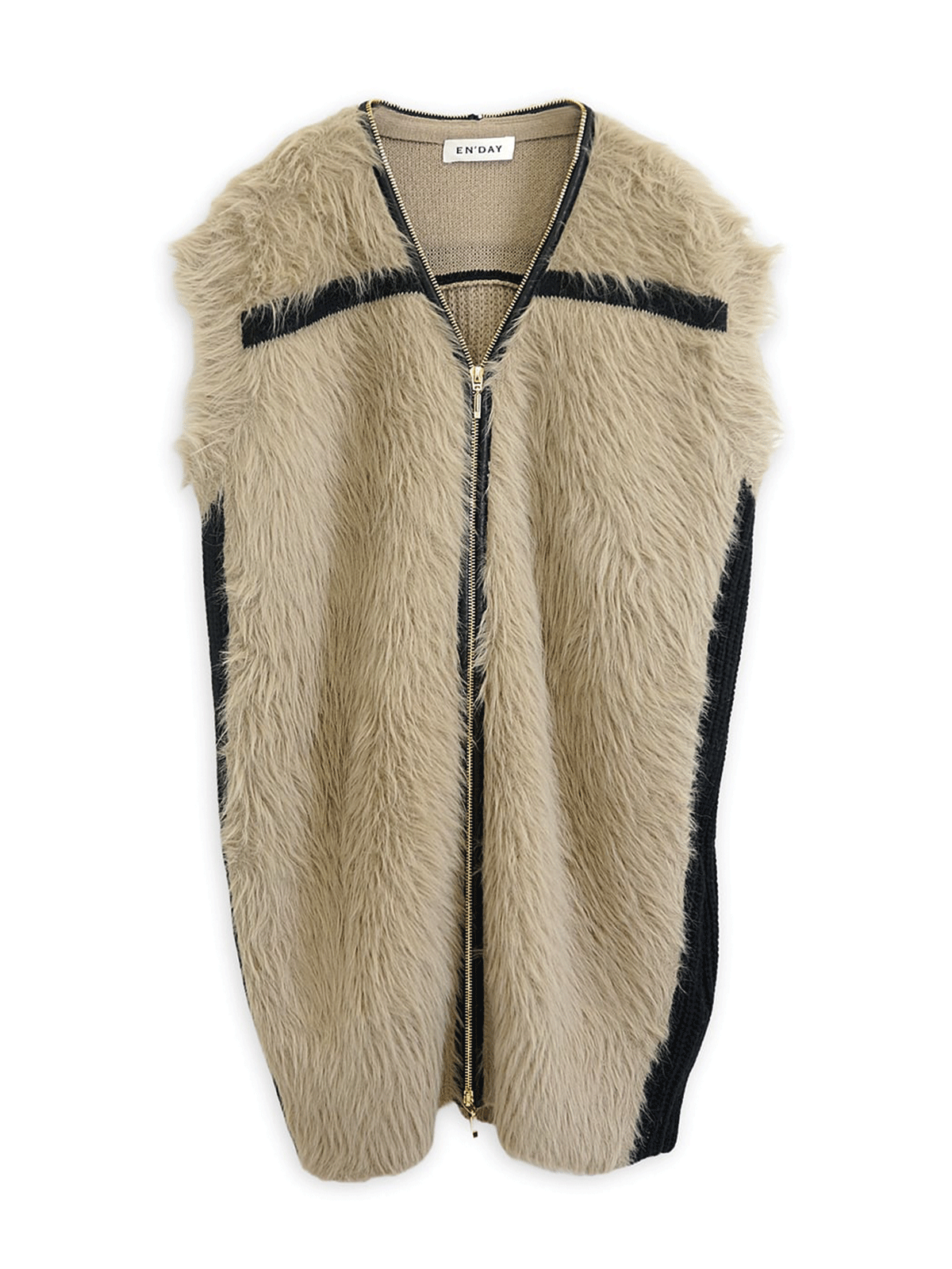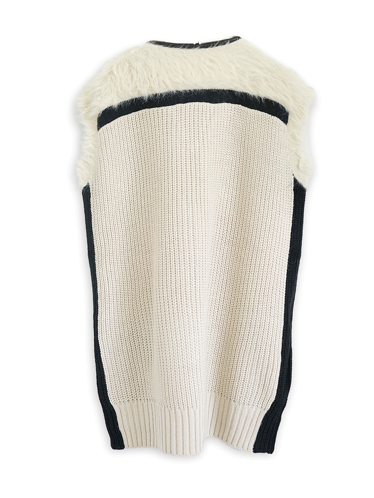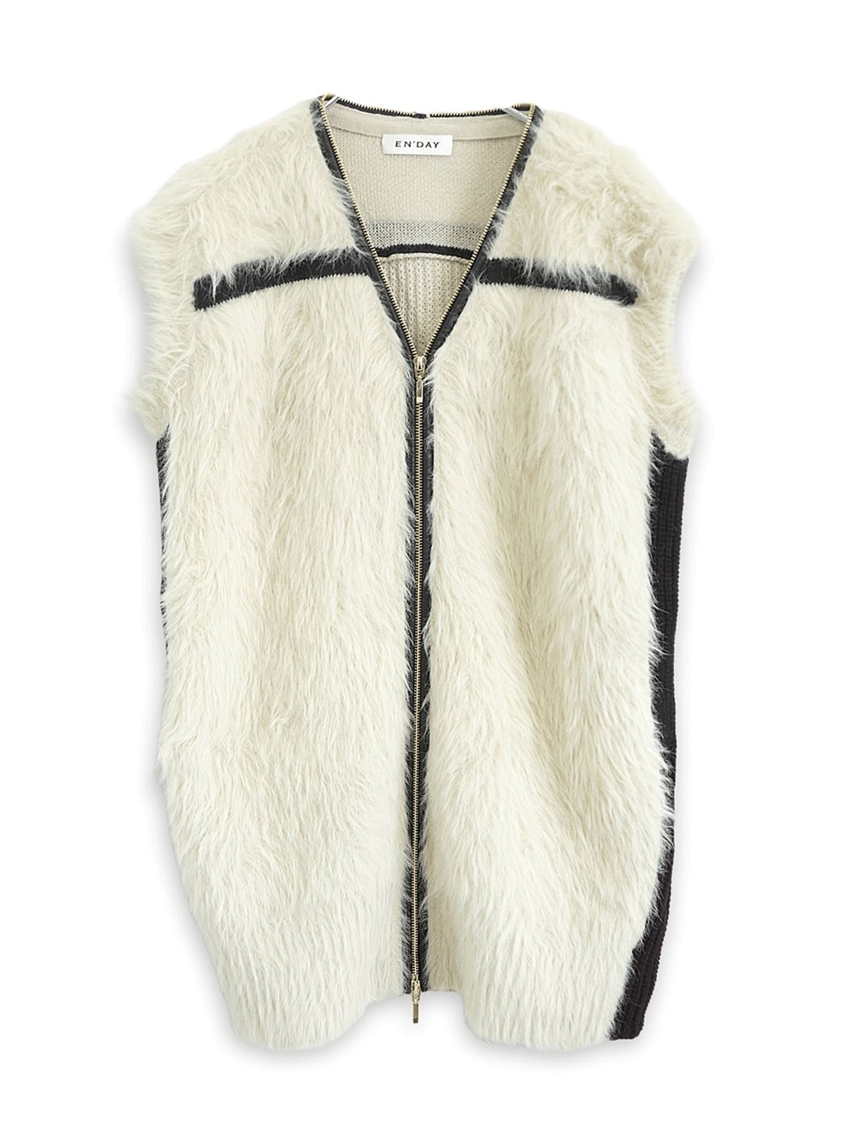 上品なシャギーヤーンの風合いを、ジップのレザーパイピングとニットの配色ラインが引き締め、大人のこなれ感のあるベストです。