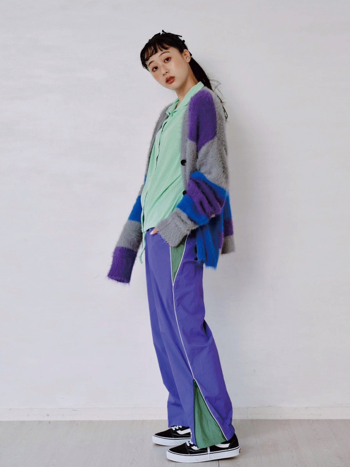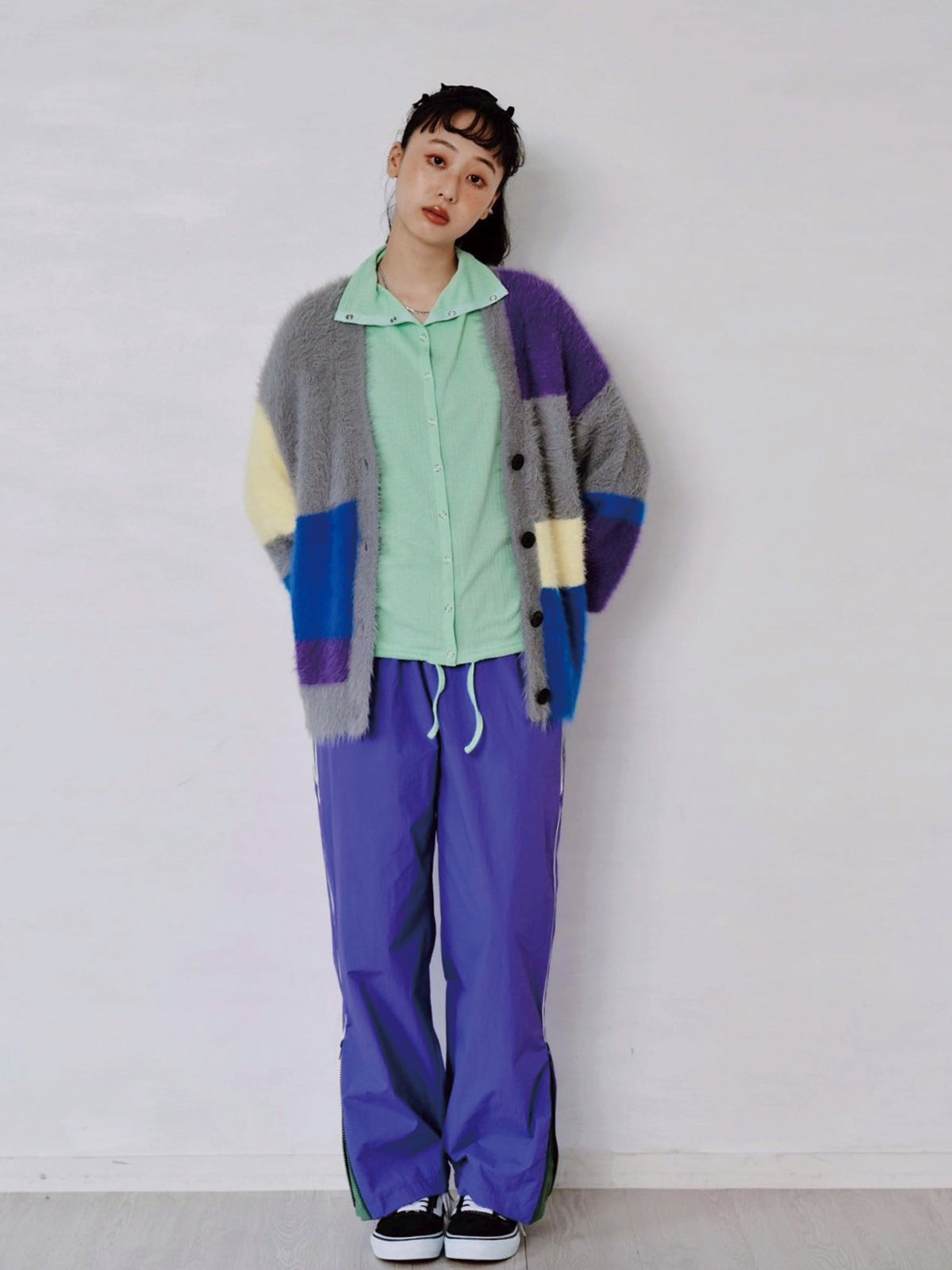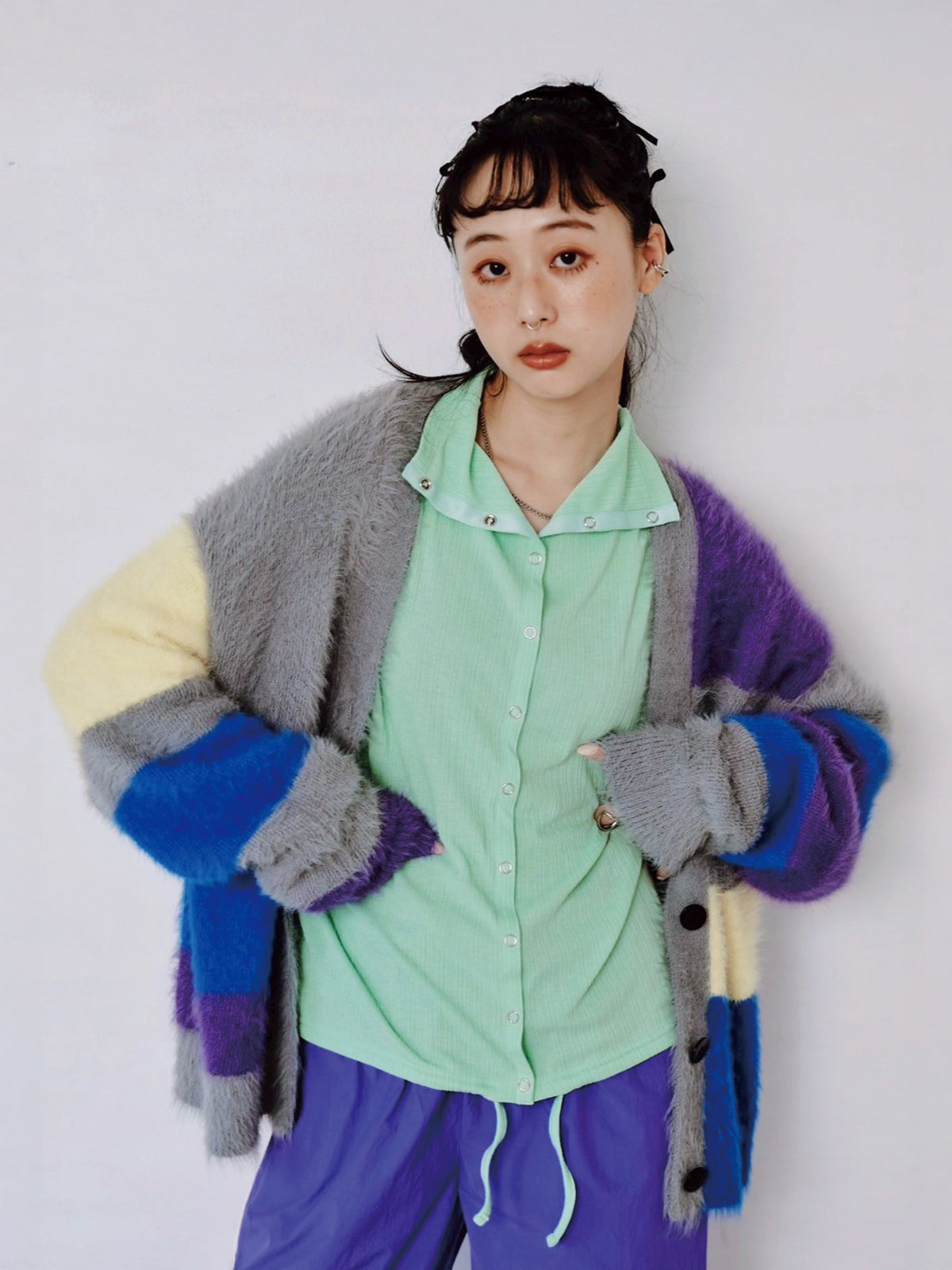 カラフルな配色が目を惹き、羽織るだけでスタイリングが華やかに。