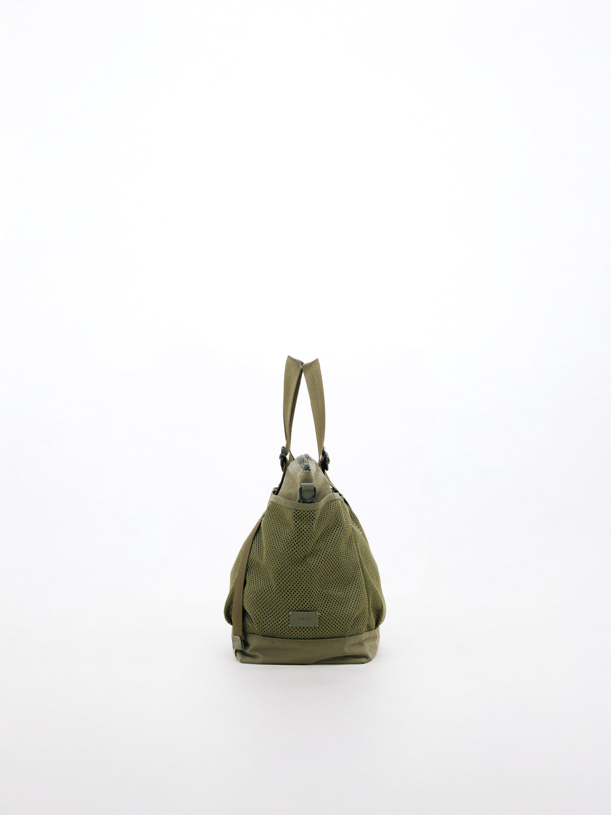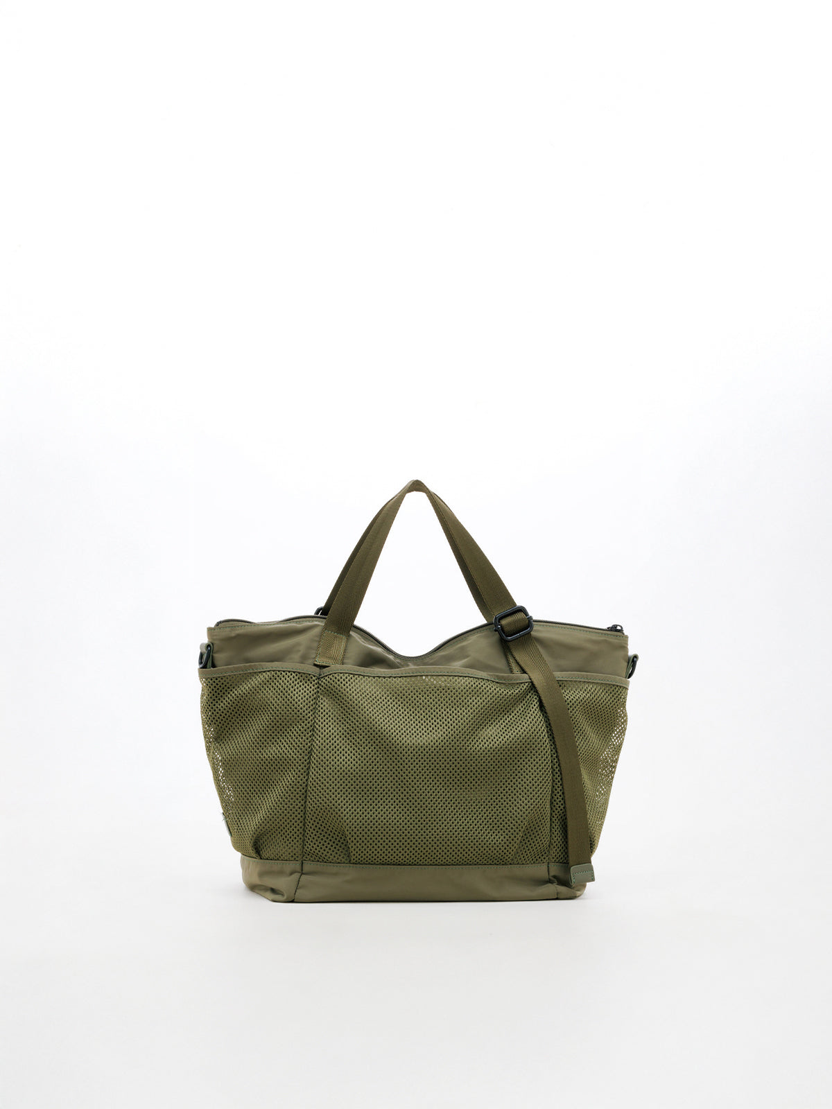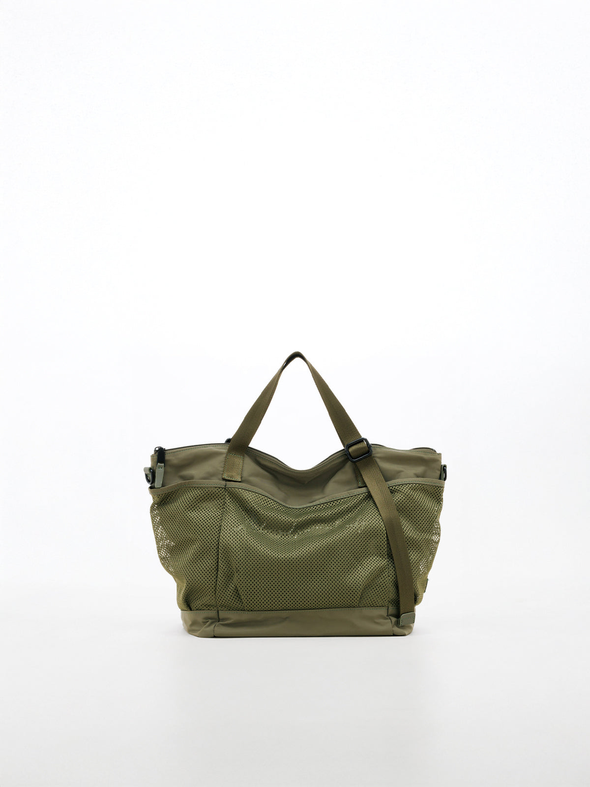 バッグ周辺に涼しげなメッシュポケット加工を配したユニセックスなミドルトート。