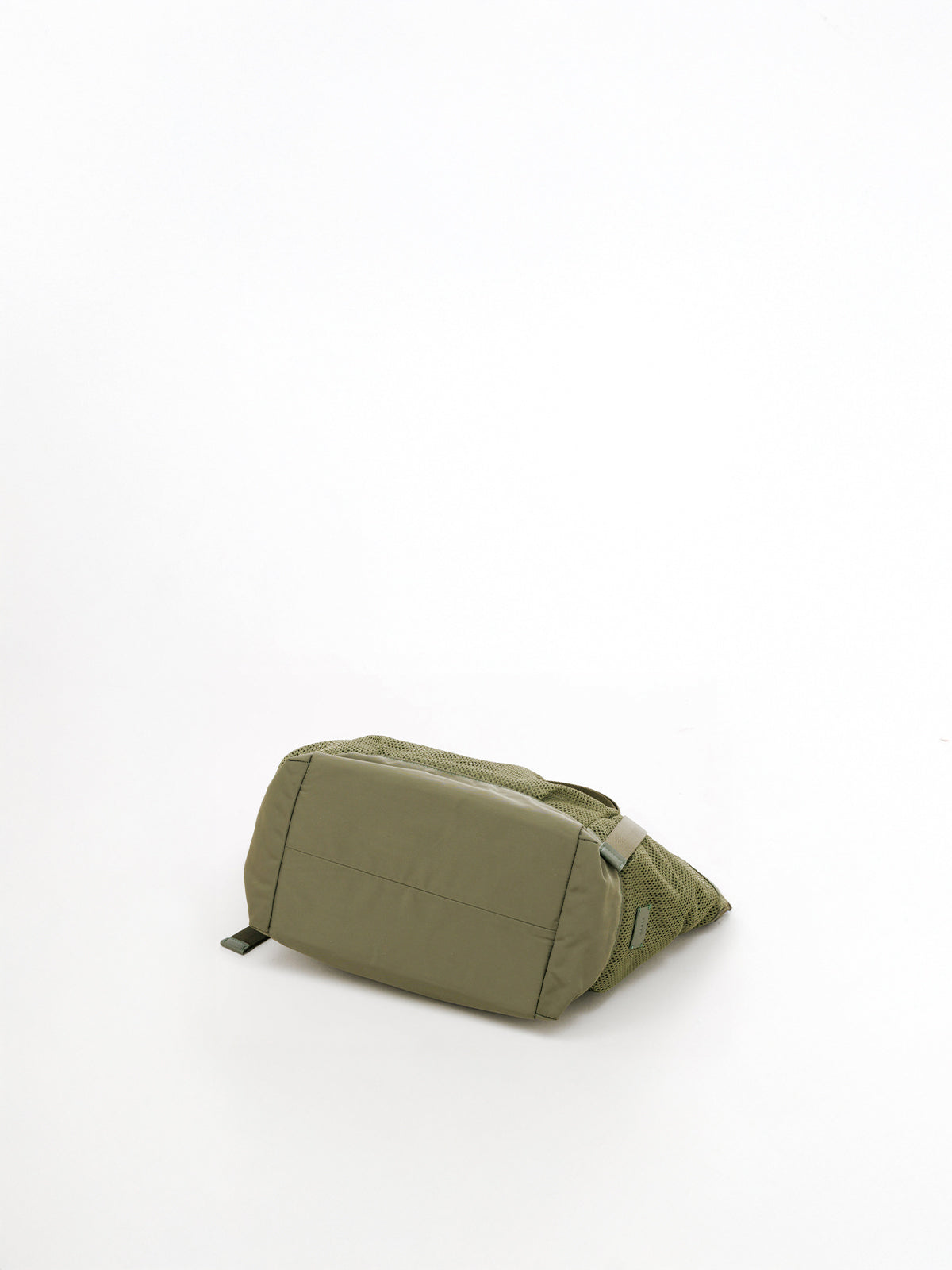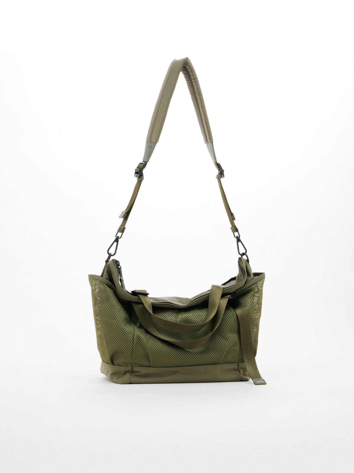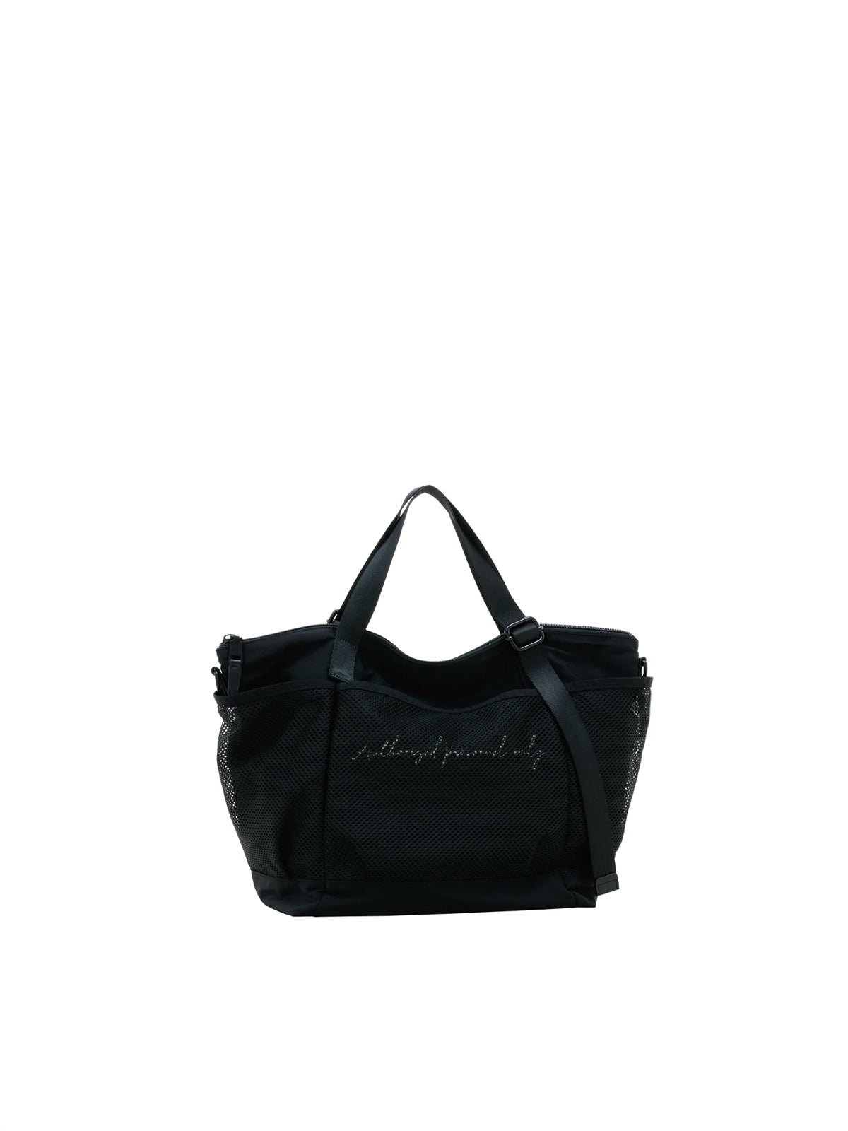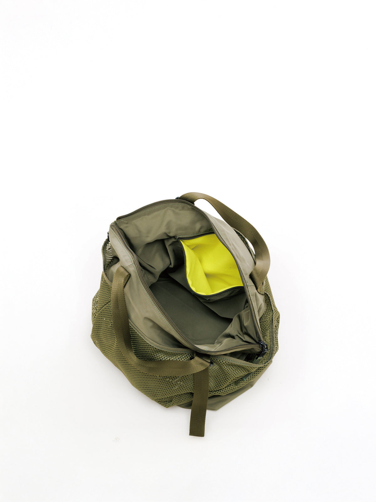 バッグ周辺に涼しげなメッシュポケット加工を配したユニセックスなミドルトート。