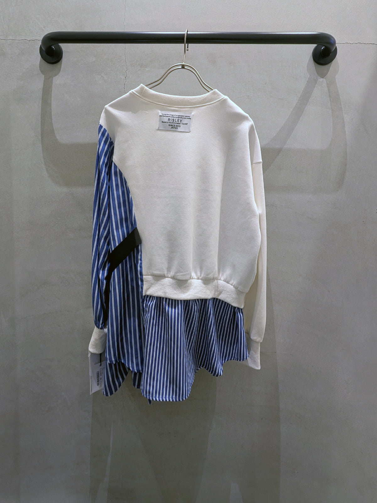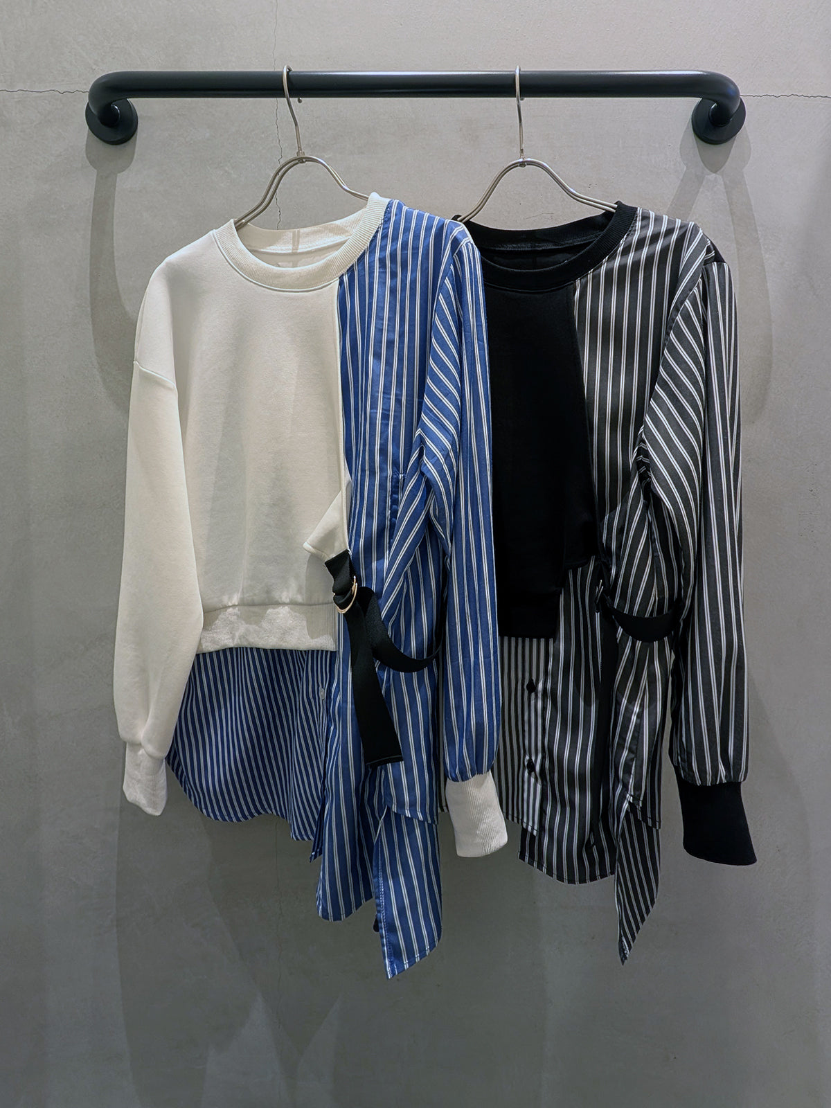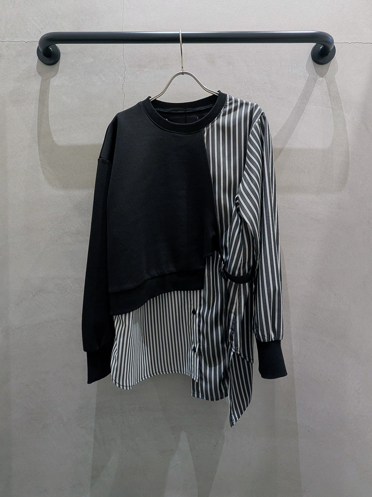 スウェットとシャツの異素材を組み合わせた、1枚で完成するドッキングスウェット。